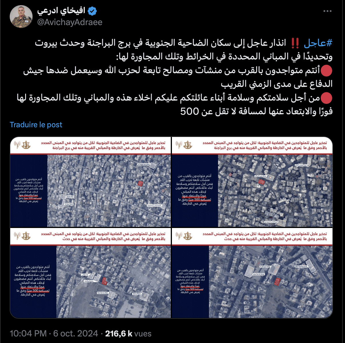 Sur l’image partagée dans le tweet d’Avichay Adraee, les bâtiments ciblés par les frappes israéliennes sont clairement localisés dans la banlieue sud de Beyrouth, plus précisément dans les quartiers de Borj el-Barajneh et Haret Hreik. Ces zones sont des bastions bien connus du Hezbollah, où de nombreuses infrastructures supposément affiliées à l’organisation sont situées. Les cartes présentes sur l’image indiquent les emplacements précis des bâtiments, marqués en rouge, qui sont visés par les frappes imminentes de l’armée israélienne.
