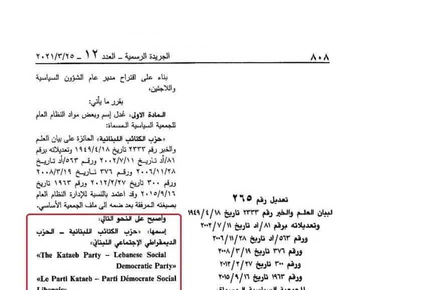 Le 26 mars 2021, le chef des Kataëb, Samy Gemayel, a annoncé que les Kataëb deviennent désormais « Le Parti Kataëb – Parti démocrate social libanais ».