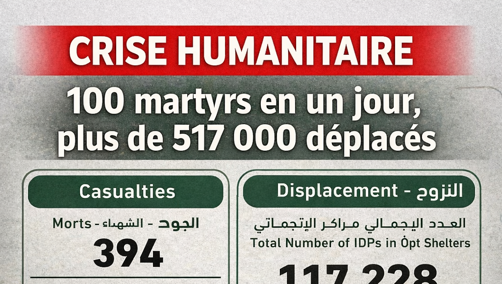 L’Unité de gestion des risques de catastrophes, rattachée directement à la Présidence du Conseil des ministres, a diffusé à 17 heures son rapport quotidien officiel sur la situation sécuritaire et humanitaire. Ce document, intitulé « Daily Situation Report », révèle un bilan particulièrement lourd : 100 martyrs supplémentaires enregistrés au cours des dernières vingt-quatre heures, portant le total cumulé à 394 morts causés par les frappes aériennes israéliennes. Les blessés s’élèvent à 1 130 au total, dont 107 rien que pour cette journée. Parallèlement, la plateforme nationale d’enregistrement des déplacés, mosa-relief.com, indiquait à 19 heures que plus de 517 000 personnes avaient été enregistrées comme déplacées internes à travers le pays. Ces chiffres, compilés par les services officiels libanais à partir des données transmises par les hôpitaux, les municipalités, la Protection civile et les centres d’accueil, dressent le portrait d’une crise humanitaire qui s’aggrave d’heure en heure sous l’effet des raids aériens israéliens.
