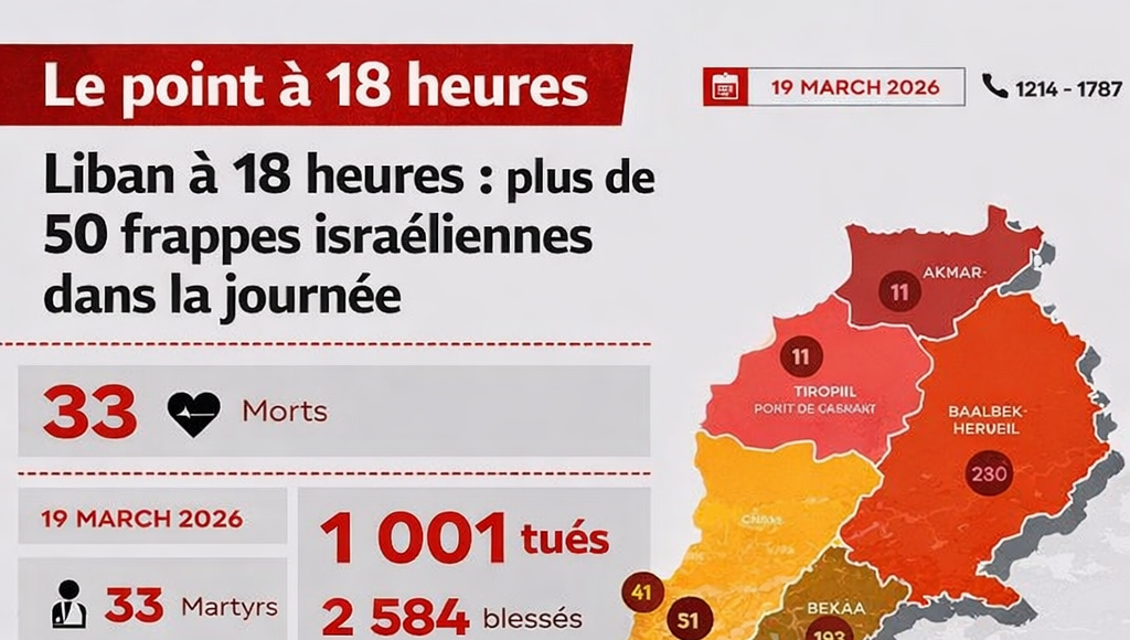 Le Liban a franchi jeudi le seuil des 1 000 morts depuis le début de l’offensive. À 18 heures, le bilan officiel fait état de 1 001 tués et 2 584 blessés. Pour la seule journée du 19 mars, 33 personnes ont été tuées et 152 blessées. Le secteur de la santé paie lui aussi un lourd tribut, avec 40 morts, 107 blessés, 42 véhicules touchés, 18 centres médicaux ou ambulatoires atteints et 5 hôpitaux fermés.