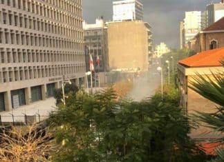 Protesters cut off traffic outside the Bank of Lebanon headquarters in Hamra.