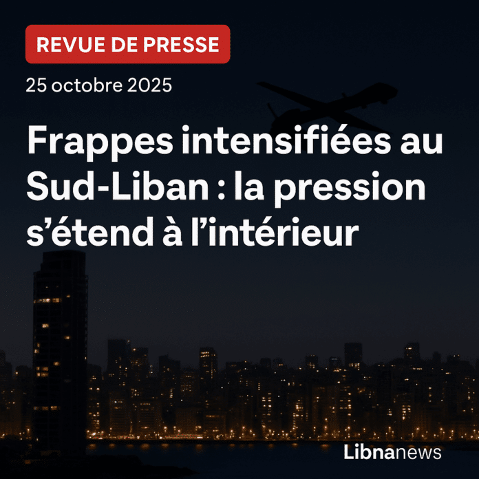 Revue de presse — 25 octobre 2025. Intensification des frappes israéliennes au Liban (Békaa, Nabatiyé, intérieur), ciblages et guerre psychologique. Coordination américano-israélienne alléguée, débats internes libanais entre 1701 et fermeté. Pistes diplomatiques via Égypte, Russie, Chine et sommet arabe au Caire, sur fond de risques d’embrasement régional.