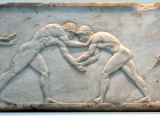 Combat de lutteurs en Grèce antique vers 510 av. J.-C.Fingalo/wikipédia, CC BY-SA