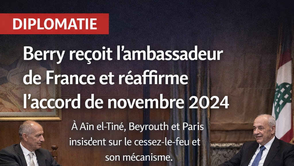 En rappelant lundi son attachement à l’accord de novembre 2024 et à ce dispositif de suivi, Nabih Berry replace donc l’échange avec l’ambassadeur de France dans un cadre diplomatique déjà existant, que Paris continue de soutenir publiquement. À ce stade, la formulation retenue après la rencontre met l’accent sur deux éléments : la poursuite des efforts français, et la volonté libanaise de s’en tenir au mécanisme prévu par l’accord pour traiter l’application du cessez-le-feu.