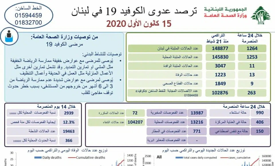 13 décès ont été donc annoncés ces dernières 24 heures. Le nombre total de personnes décédées est de 1 223 depuis l’apparition de la maladie au Liban, le 21 février 2020.