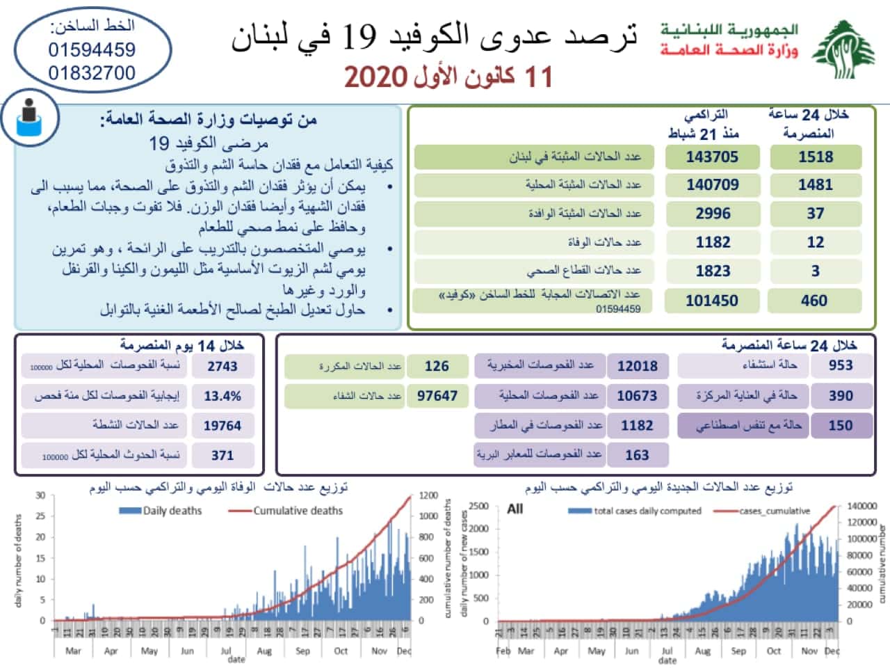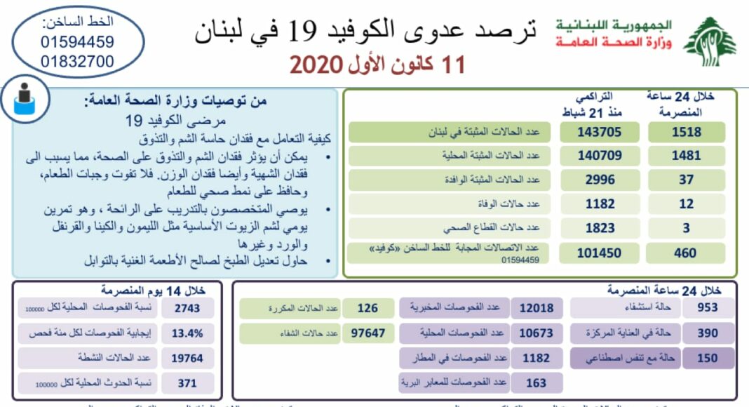 12 décès ont été donc annoncés ces dernières 24 heures. Le nombre total de personnes décédées est de 1 182 depuis l’apparition de la maladie au Liban, le 21 février 2020.