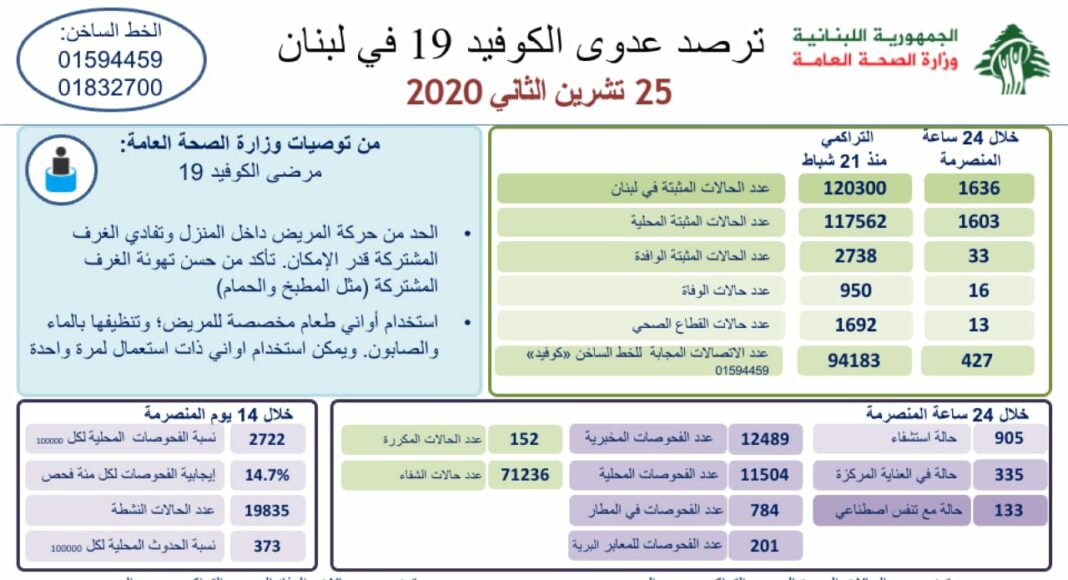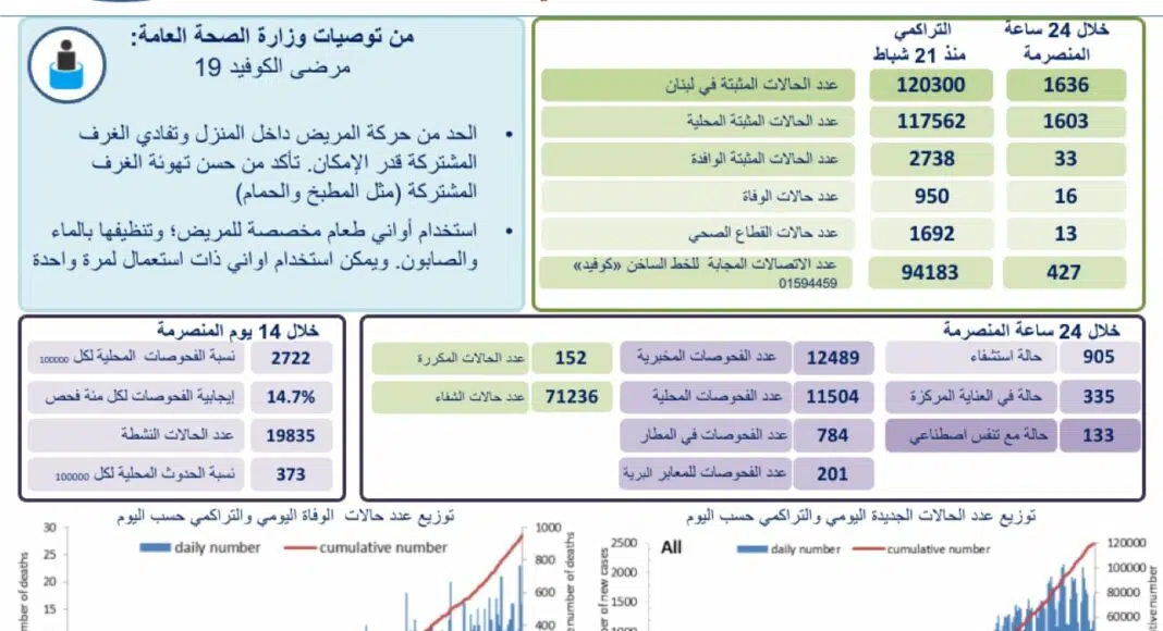 Les autorités libanaises annoncent que 1 636 personnes ont été testées positives. Le nombre de décès est de 16 personnes.