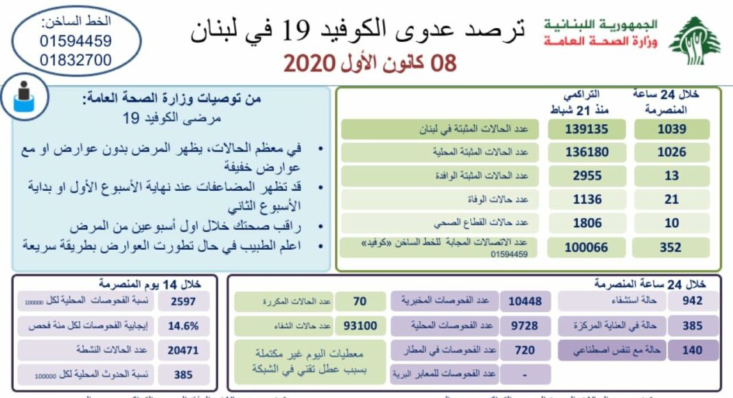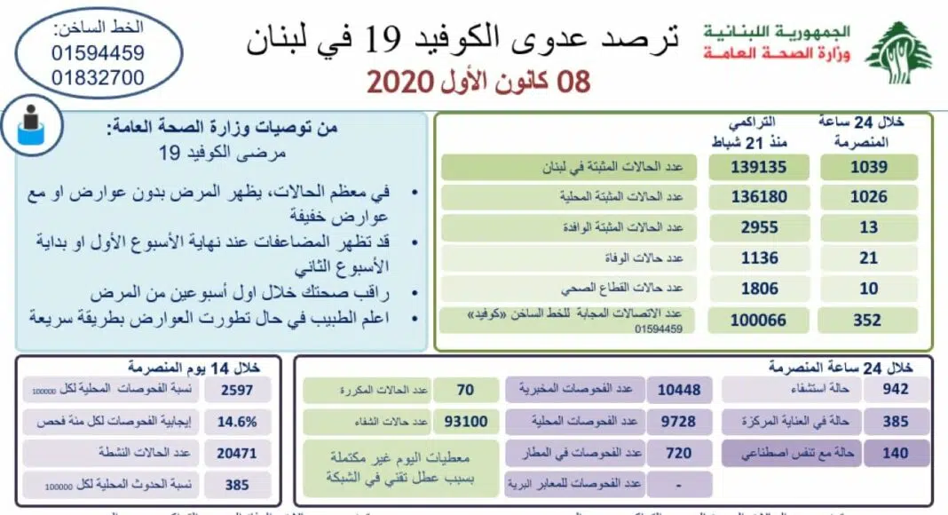 Au total, 139 135 ont été contaminées depuis le 21 février 2020, date de la découverte d’un premier cas au Liban, passant donc du seuil des 100 000 cas depuis ce vendredi 13 novembre.