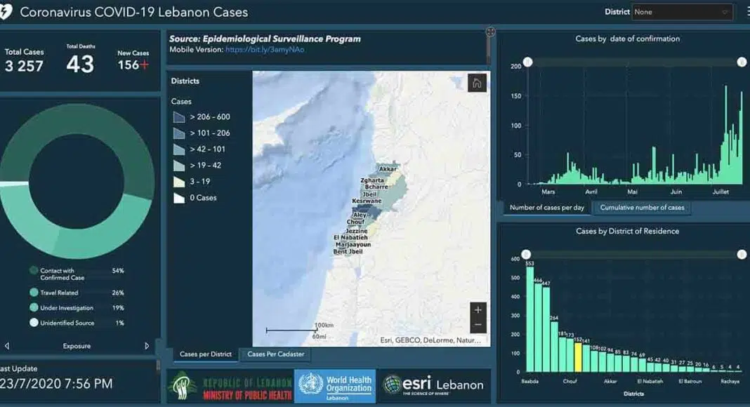 Les autorités libanaises indiquent que 156 personnes ont été diagnostiquées positives au coronavirus COVID19 ce jeudi. Ce chiffre porte à 3 260, le nombre de contamination depuis l’apparition de la maladie au Liban, le 21 février.