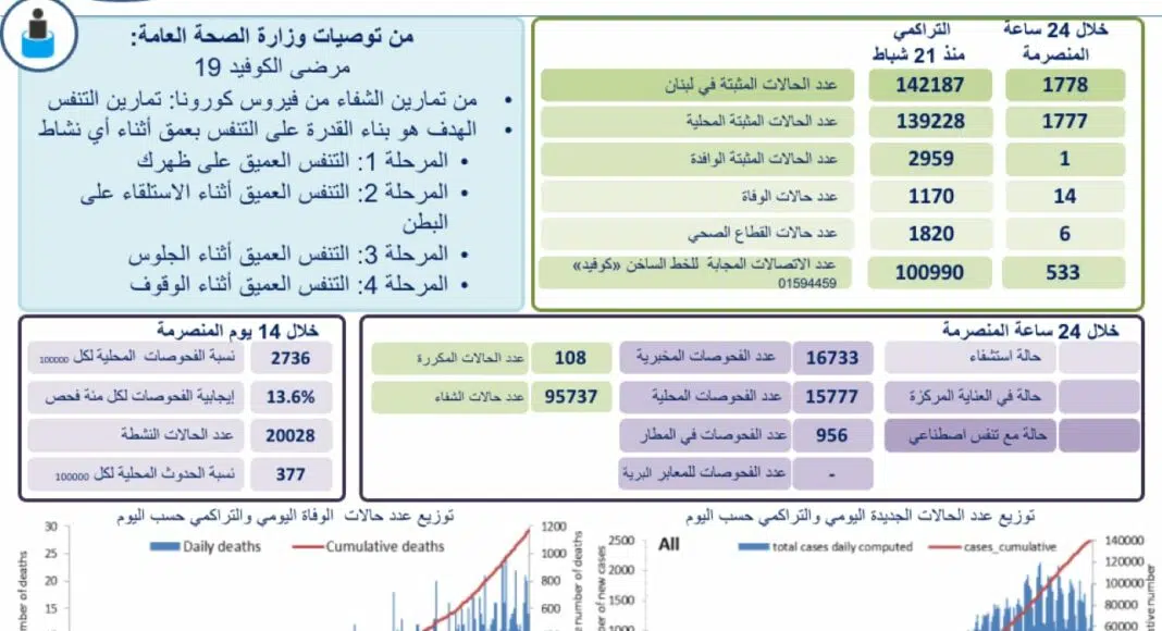 14 décès ont été donc annoncés ces dernières 24 heures. Le nombre total de personnes décédées est de 1 170 depuis l’apparition de la maladie au Liban, le 21 février 2020.