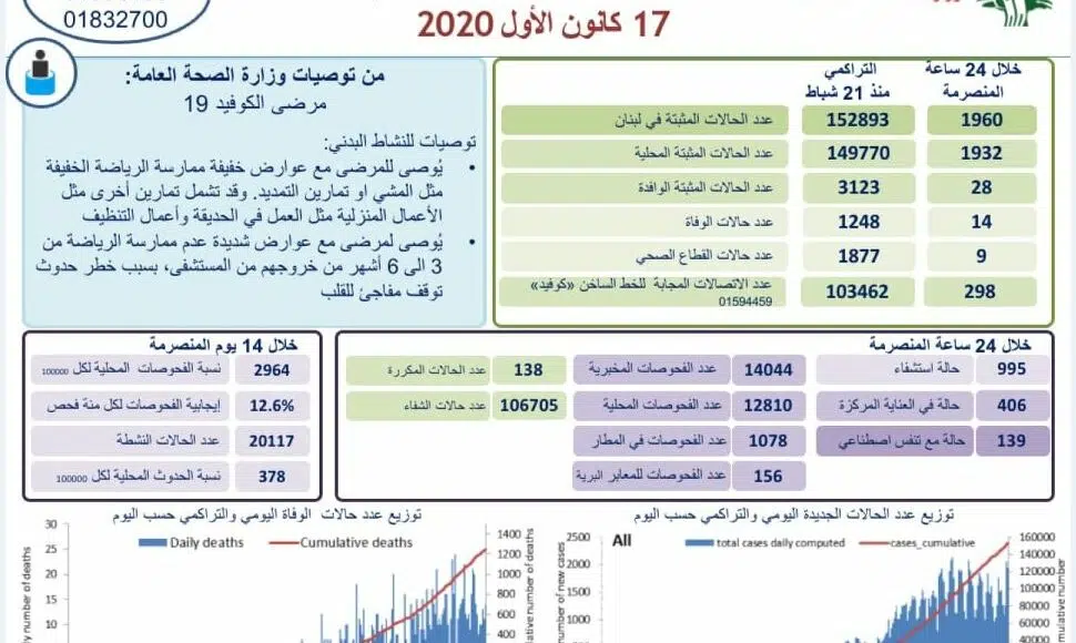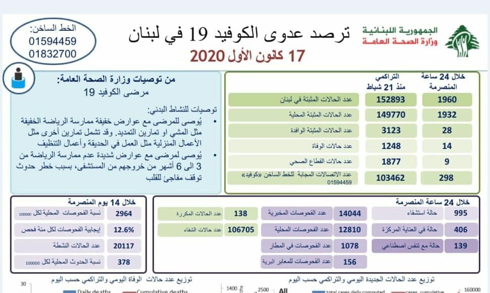 14 décès ont été donc annoncés ces dernières 24 heures. Le nombre total de personnes décédées est de 1 248 depuis l’apparition de la maladie au Liban, le 21 février 2020.