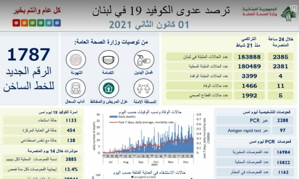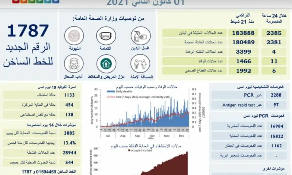 11 décès ont été donc annoncés ces dernières 24 heures. Le nombre total de personnes décédées est de 1 458 depuis l’apparition de la maladie au Liban, le 21 février 2020.