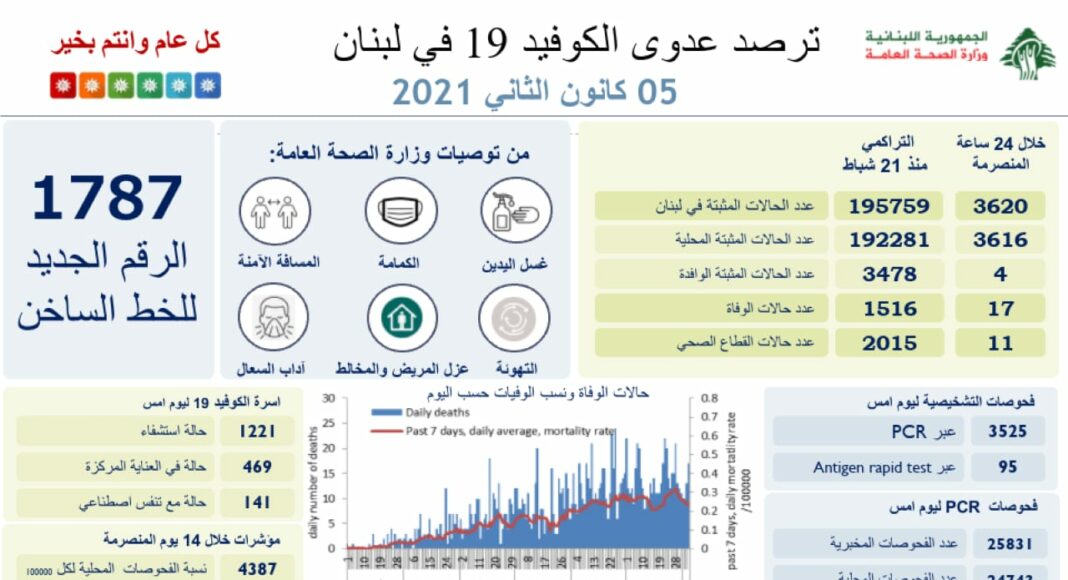 Le ministère de la santé a indiqué que 3 620 personnes ont été diagnostiquées positives au coronavirus COVID19 ces dernières 24 heures. 17 personnes sont également décédées, indiquent les autorités libanaises, alors que les mesures de confinement devraient entrer en vigueur demain.
