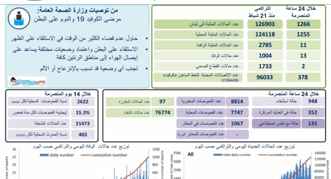 Les autorités libanaises annoncent que 1 266 personnes ont été testées positives. Le nombre de décès est de 13 personnes.