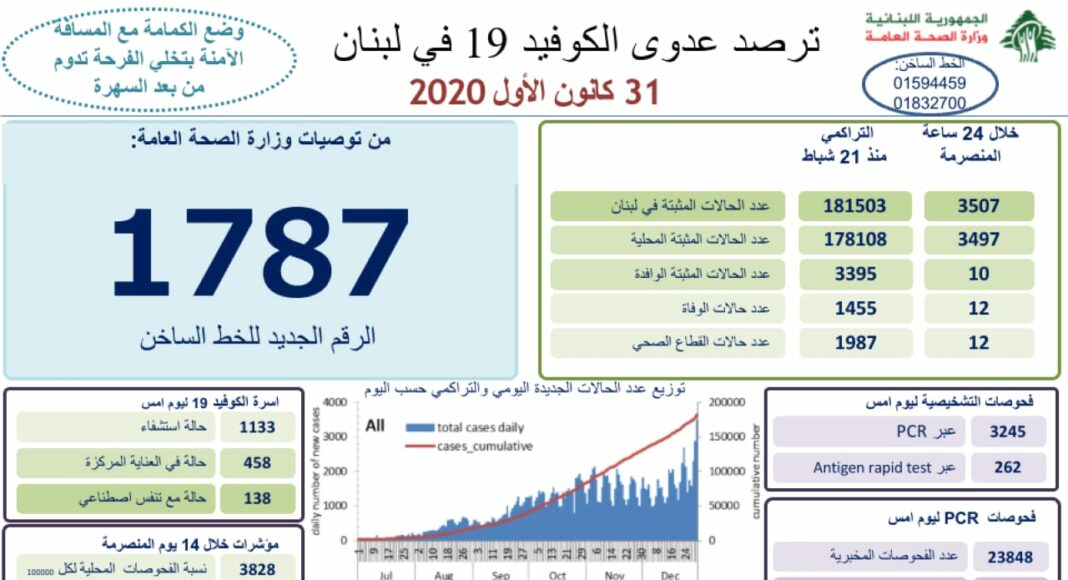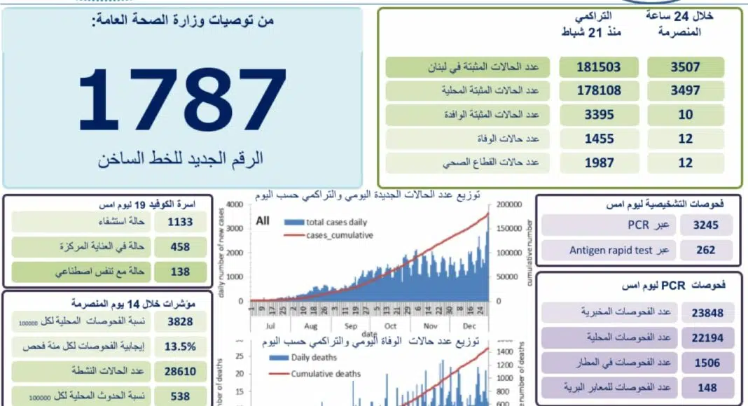 12 décès ont été donc annoncés ces dernières 24 heures. Le nombre total de personnes décédées est de 1 458 depuis l’apparition de la maladie au Liban, le 21 février 2020.