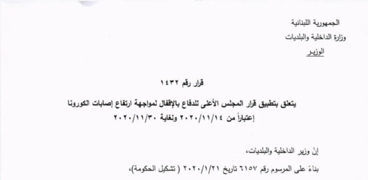 Lire l’articleStopLes autorités libanaises ont annoncé les séries de mesures qui devraient entrées en vigueur du 14 novembre au 30 novembre et décidées suite à l’augmentation importante du nombre de cas de personnes contaminées par le coronavirus COVID-19. Ainsi, un couvre-feu devrait être imposé sur l’ensemble du territoire, de 5 heures de l’après-midi à 5 … Lire la suite de Liban/Coronavirus: les mesures du reconfinement détaillées par les autorités
