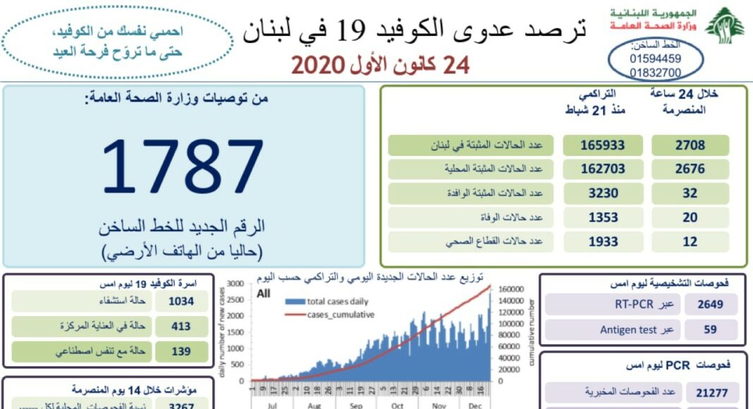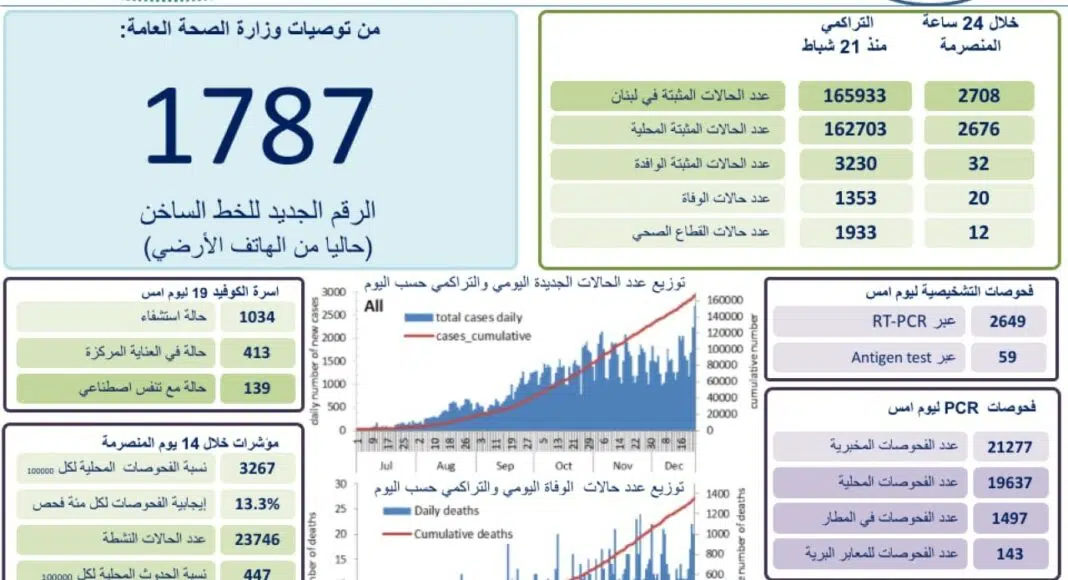 20 décès ont été donc annoncés ces dernières 24 heures. Le nombre total de personnes décédées est de 1 353 depuis l’apparition de la maladie au Liban, le 21 février 2020.