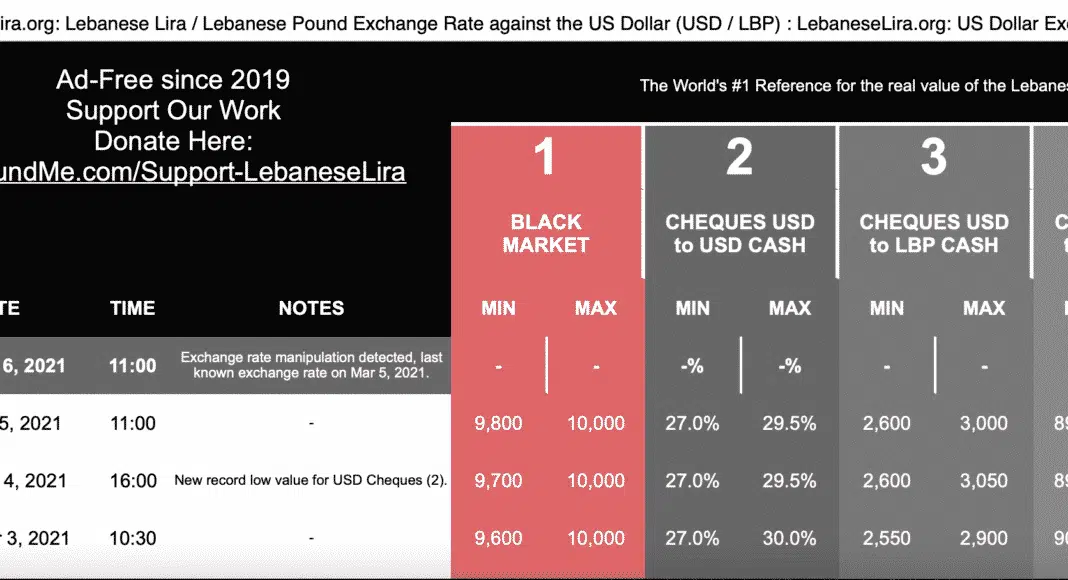Il s’agit notamment du cas du site LebaneseLira.org qui indique que la dernière cotation valide de la livre face au billet vert serait celle du 5 mars, soit à 9 800 LL/USD à l’achat et à 10 000 LL/USD à la vente. D’autres plateformes indiquent que la situation actuelle dépasse tout entendement, appelant leurs utilisateurs à la prudence.