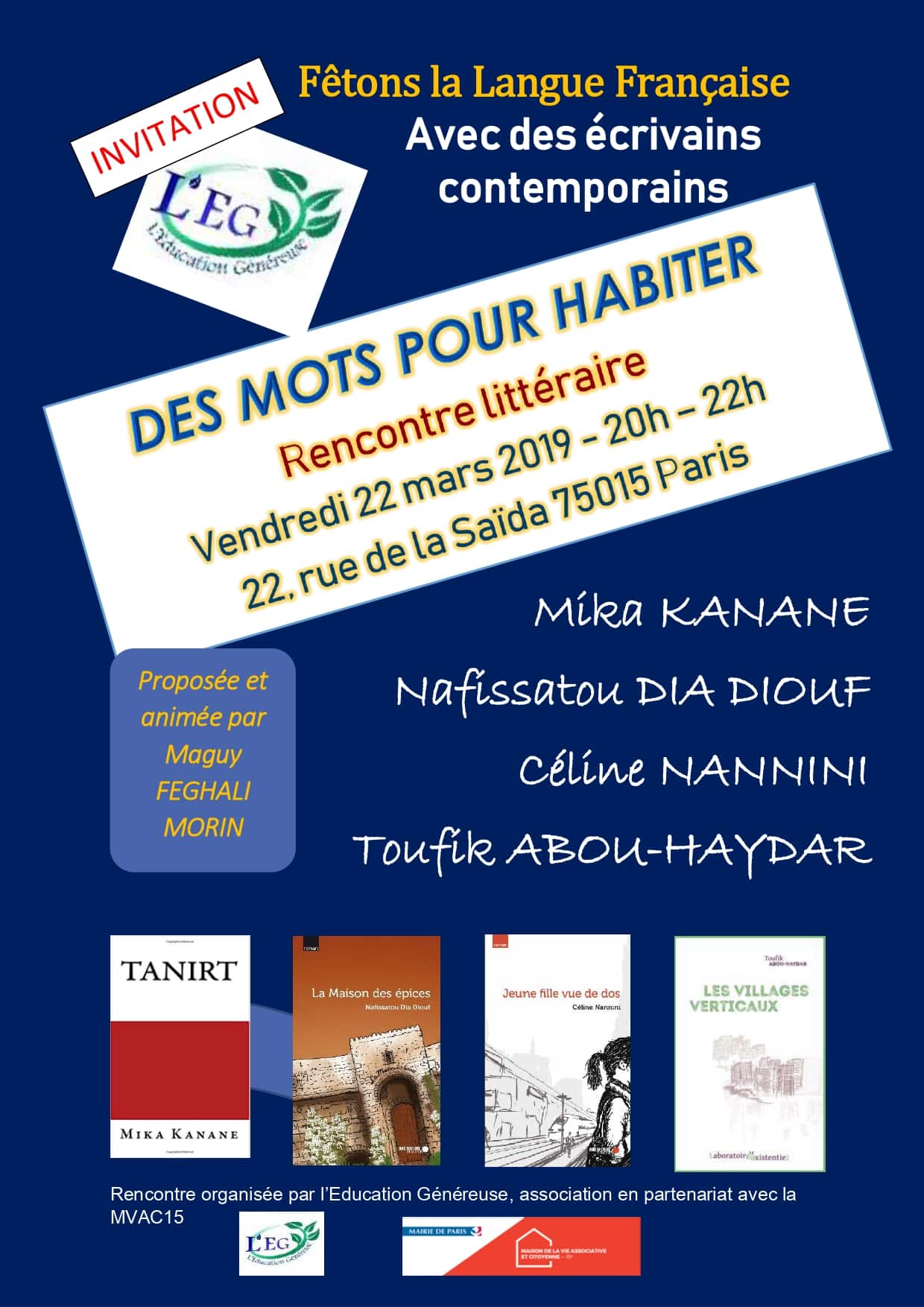 De concert, quatre écrivains ont enchanté le public avec une rencontre littéraire organisée ce vendredi 22 mars dans le 15èmearrondissement parisien sous le thème : « Des mots pour habiter ».