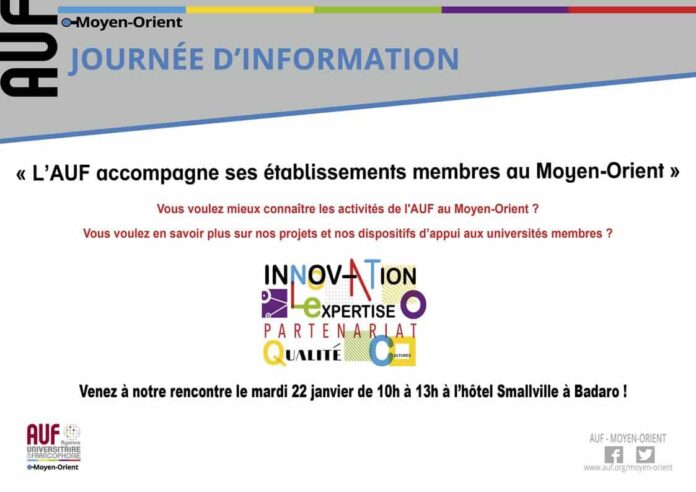 Pour mieux servir ses établissements membres, la direction régionale Moyen-Orient de l’Agence universitaire de la Francophonie (AUF) organise une journée d’information sur ses projets et dispositifs d’appui le mardi 22 janvier 2019, de 10h à 13h, à l’hôtel Smallville, à Badaro, Beyrouth.