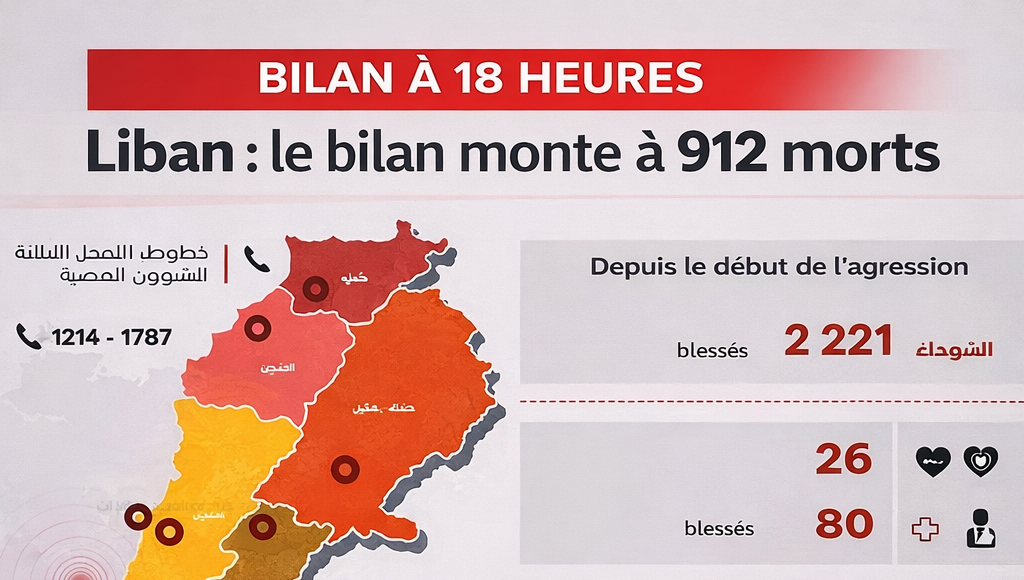 Le ministère libanais de la Santé publique a annoncé, dans son rapport quotidien publié mardi 17 mars par le Centre des opérations d’urgence sanitaire, que le nombre total de morts depuis le 2 mars s’élève désormais à 912, tandis que le nombre total de blessés atteint 2 221. L’Agence nationale d’information a relayé ce bilan en fin d’après-midi.