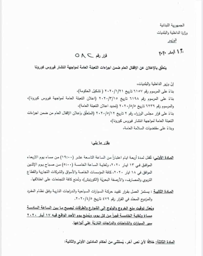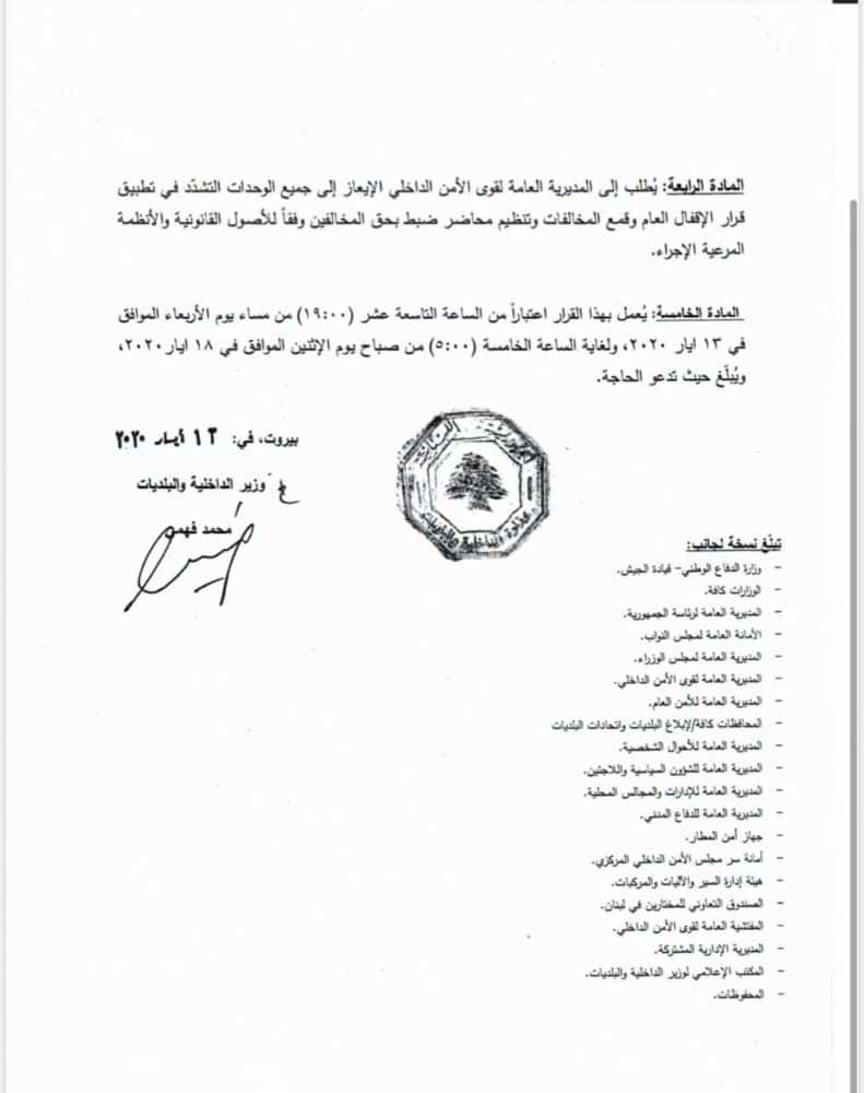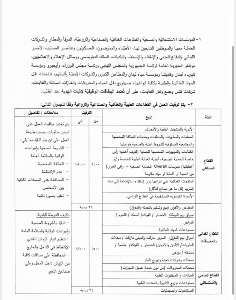 Sont exclus de ces restrictions, le personnel hospitalier et des établissements de santé, les personnes liées au secteur alimentaire, industriel et agricole, les employés du port et de l’aéroport, ainsi que des entreprises qui y sont liées, les médecins et infirmières, les membres de l’Armée, de la Croix Rouge, de la protection civile, les pompiers et les ambulances, le corps diplomatique, les médias, la direction générale de la présidence de la république, les ministres, les employés d’Ogero, les sociétés de sécurité, les camions de transport alimentaires et médicaux, de déchets à condition d’avoir préalablement demandé l’autorisation.