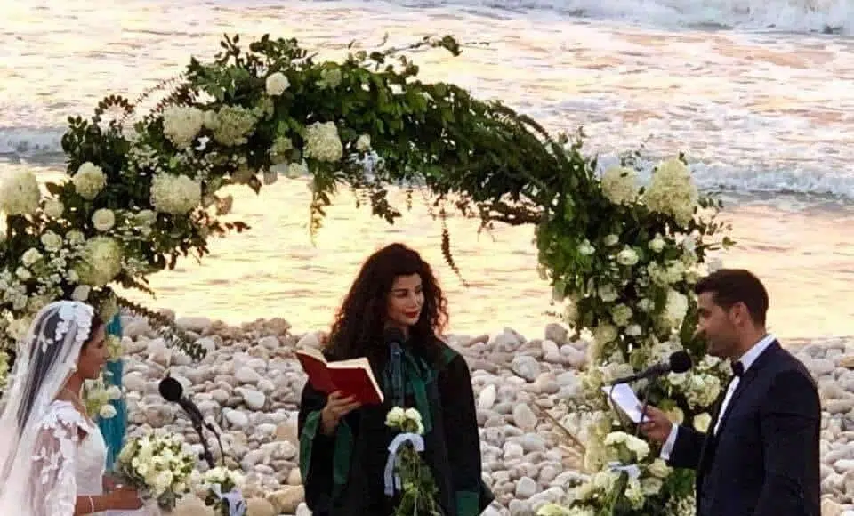 Une photo singulière circule depuis ce matin sur les réseaux sociaux, faisant état d’une scène de mariage contracté sur une plage au Liban avec au centre une figure relativement connue. Des noces un peu hors du commun, non parce que la cérémonie se déroule en plein air sur la plage de Tyr sous une arche historiée de fleurs blanches, mais parce que la personne officiante est l’ex candidate aux dernières législatives, la journaliste Joumana Haddad, parée tel un magistrat.