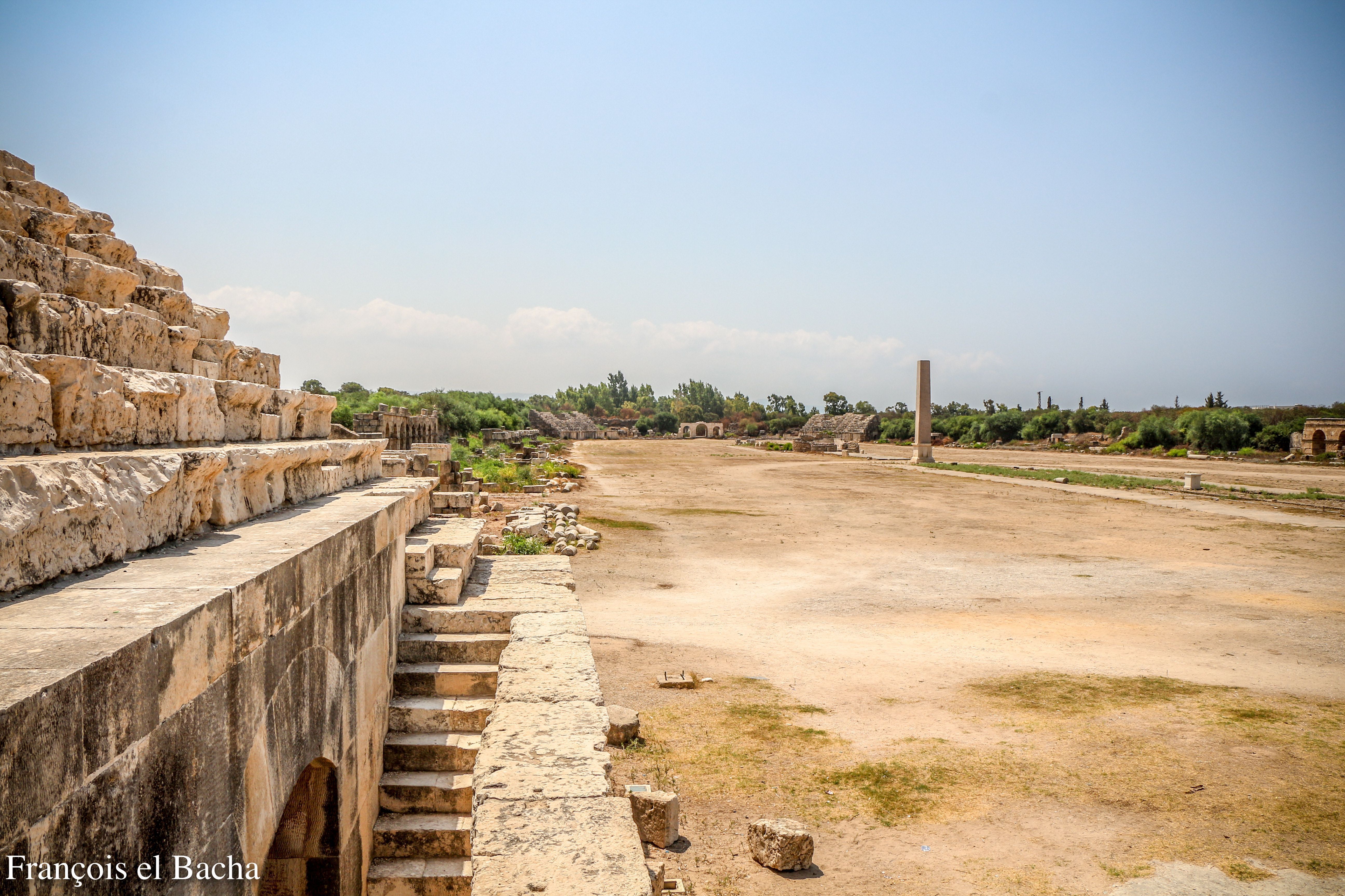 D’une longueur de 470 mètres et d’une largeur de 125 mètres, l’hippodrome, mis à jour par l’éminent archéologue Maurice Chéhab, occupe une surface totale de 54 000 mètres carrés pour une capacité de 36 000 personnes. Alors que l’essentiel de sa structure a disparu, il demeure quelques tribunes dont on peut découvrir les salles voutées et les gradins qui dominaient les pistes. Au milieu de sa structure, très bien conservé, la Spina et un obélisque malheureusement décapité. La Spina comptait également des statues aujourd’hui disparues et ses 2 extrémités étaient marquées par une borne appelée Méta, autour duquel les chars devaient procéder à un virage serré.