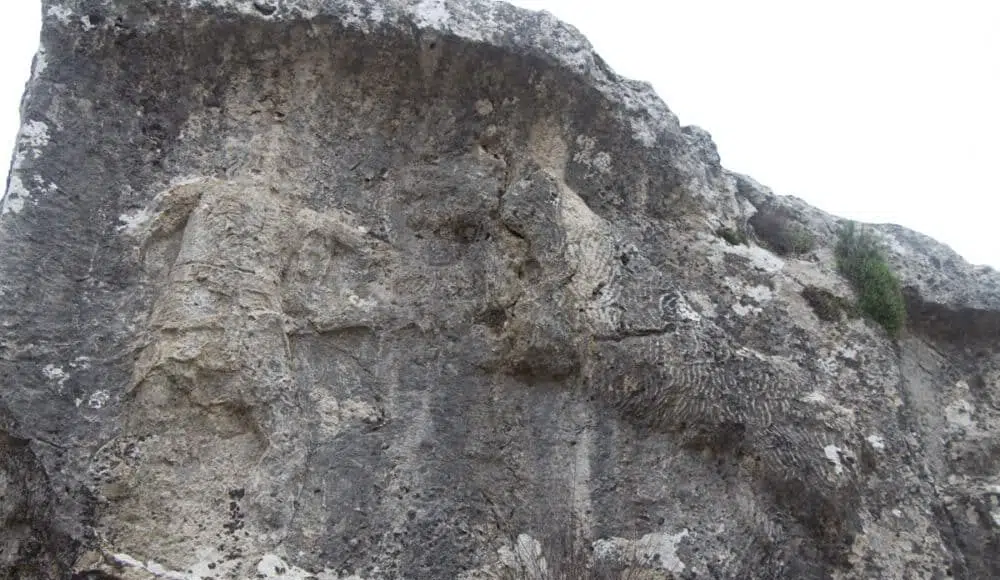 Il s’agit de cette scène qu’Ernest Renan attribuera à la légende qu’on retrouve sur le bas-relief de la Tombe de Ghineh. Cette figure daterait d’une époque hellénistique. Il s’agit d’une scène de chasse où un animal, un ours selon certains, un sanglier selon d’autres fait face à un chasseur armé d’une lance.