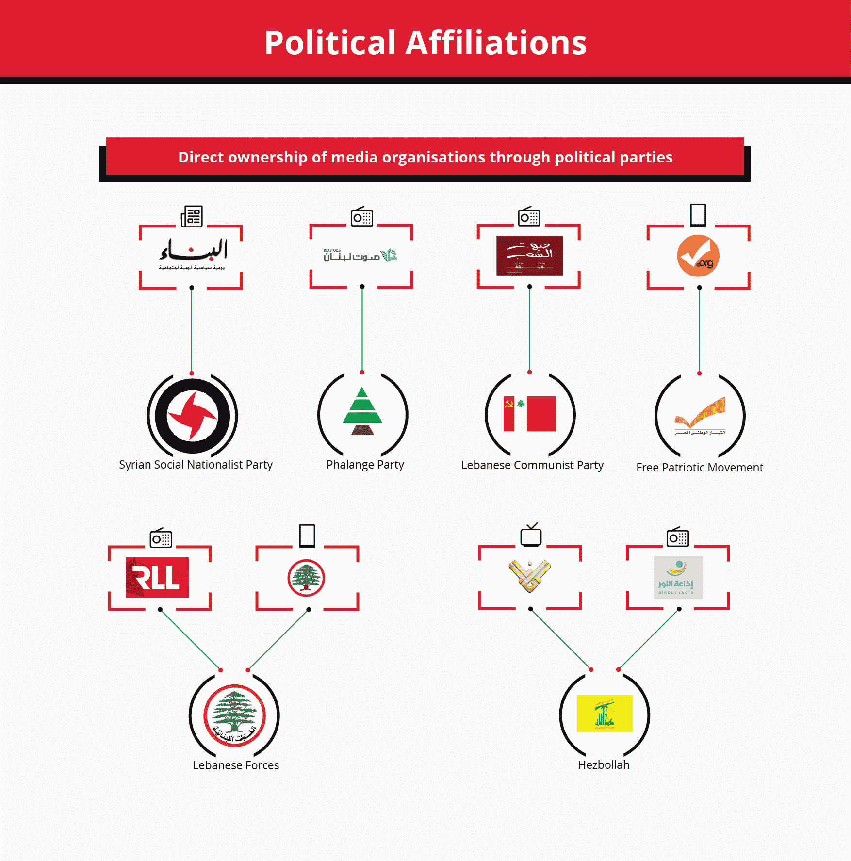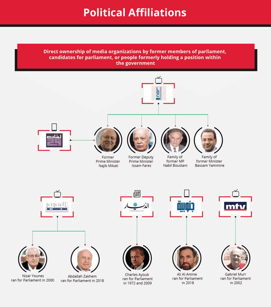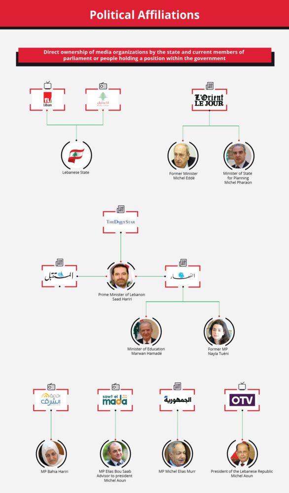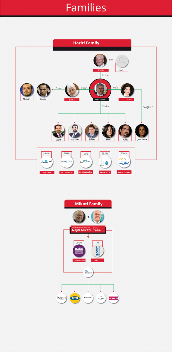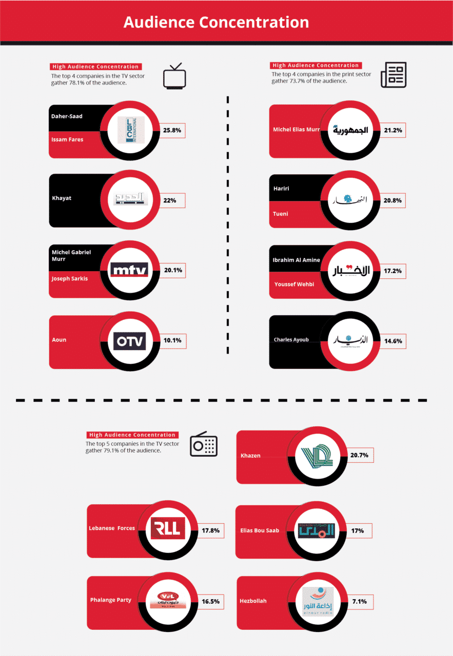 32% des médias les plus influents sont aux mains de 8 familles – souvent liées à des hommes politiques -, soit 30% de parts de marchés pour ce qui est de la télévision, 72% des audiences radiophoniques et 60% du lectorat. Les principaux actionnaires de ce secteurs sont Michel Elias Murr, Hariri et Tuéni, Ibrahim Al Amine et Charles Ayoub
