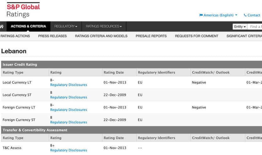 Dans la dernière mise à jour du rapport de Standard & Poor’s concernant l’économie libanaise, en date du 1er mars 2019, les obligations libanaises, libellés tant en devise locale qu’en devise étrangère ont maintenue leur note à B-, considérée comme étant très spéculative, un cran en dessous de CCC+, mais vu leurs perspectives passer de stable à négatif.