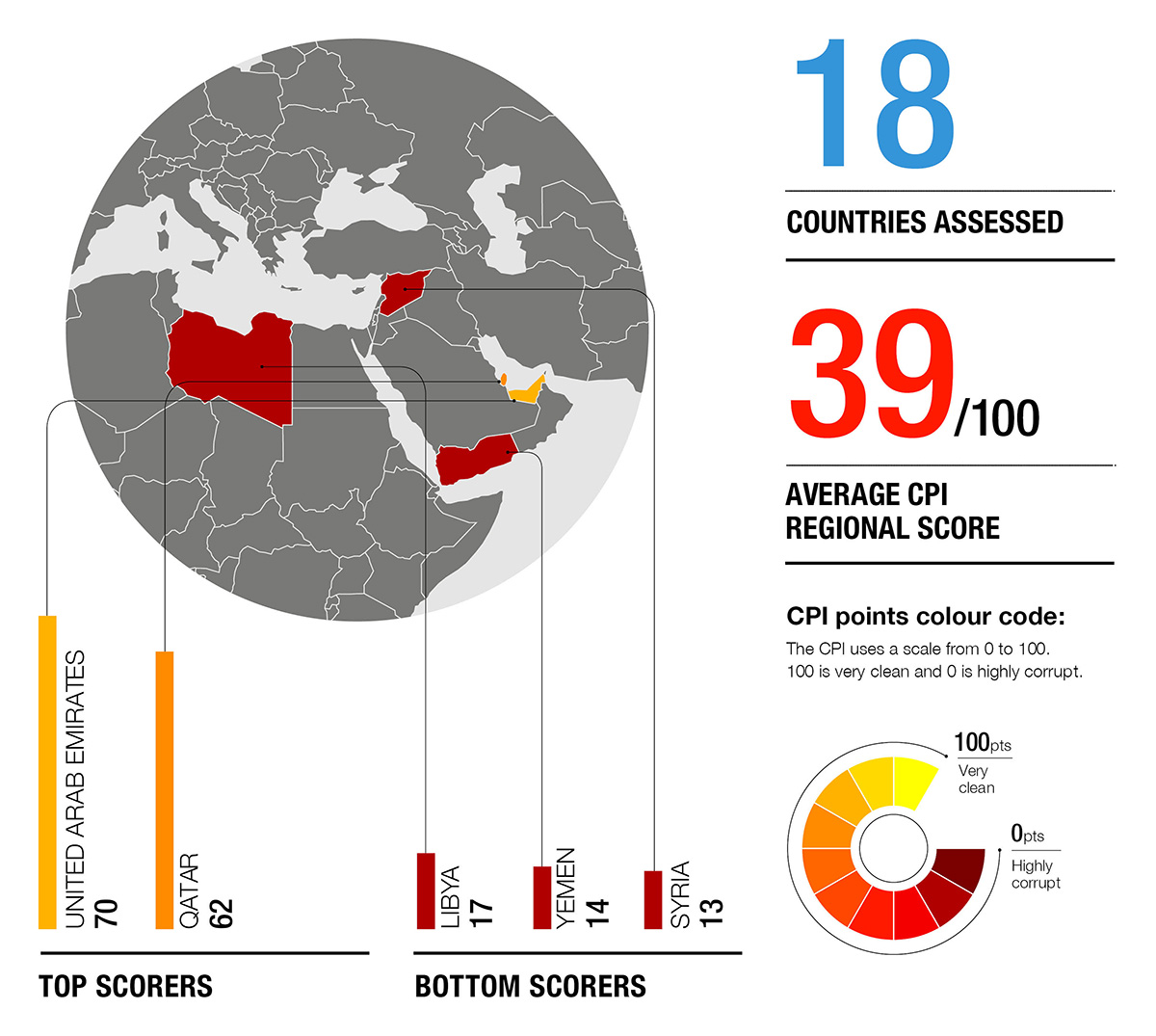 Avec un score moyen de 39, la région du Moyen-Orient et de l’Afrique du Nord est à la traîne par rapport aux régions Amériques et Asie-Pacifique (score moyen pour les deux: 44) et ne fait que légèrement mieux que l’Europe de l’Est et l’Asie centrale (score moyen: 35) et Afrique subsaharienne (score moyen: 32)