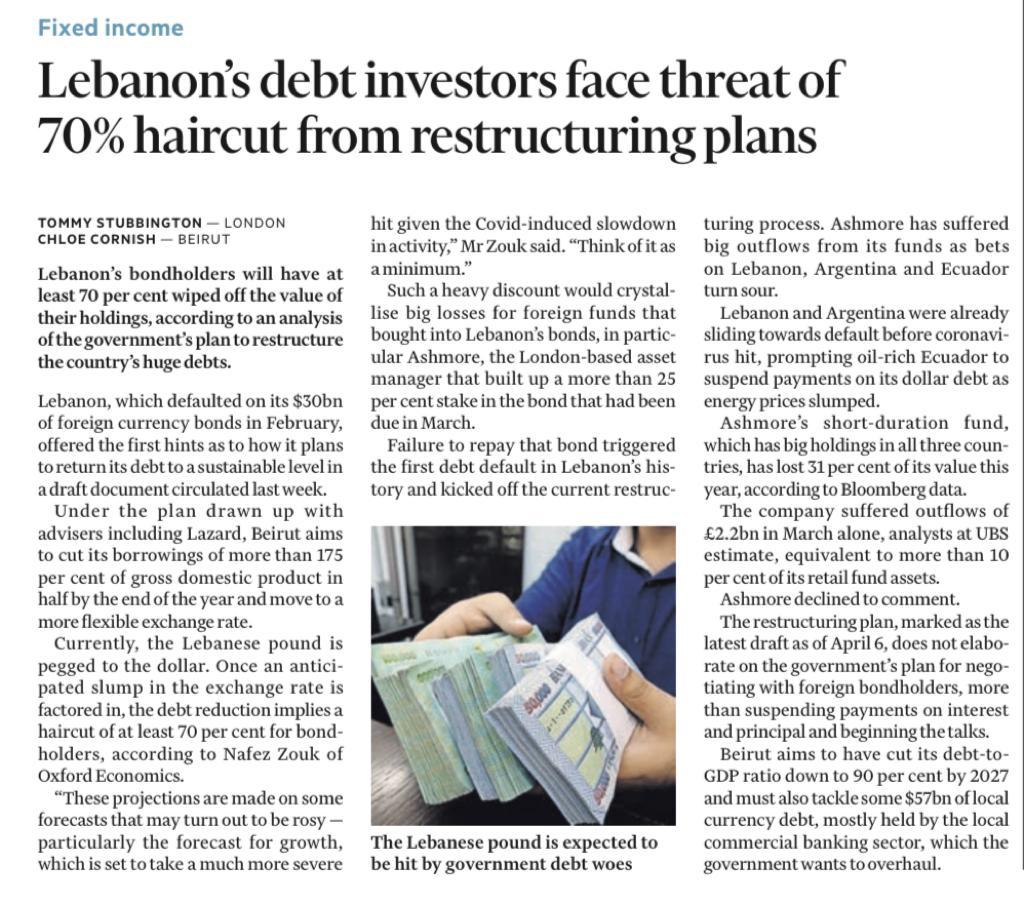 Cette information intervient alors que le Liban déclaré un état de défaut de paiement début mars, un préalable nécessaire à la restructuration de l’importante dette économique qui atteint 176% du PIB, indiquent les autorités actuelles. Le Pays des Cèdres est également impacté par une large crise économique, encore aggravée par le contrôle des capitaux mis en place unilatéralement depuis novembre 2019 par l’Association des banques du Liban et non les organismes de tutelle comme la Banque du Liban ou le Ministère des Finances.