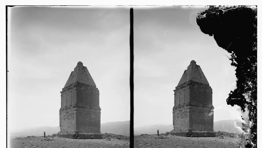 Cette photographie stéréoscopique, prise entre 1898 et 1946 par le Matson Photo Service, présente l’imposante pyramide de Kamouh el-Hermel, située au sud de la ville d’Hermel, au Liban. Ce monument solitaire, également appelé la « lance d’Hermel », se dresse sur une colline dénudée, dominant le paysage environnant. Ce cliché met en valeur l’architecture énigmatique et majestueuse de ce monument antique.