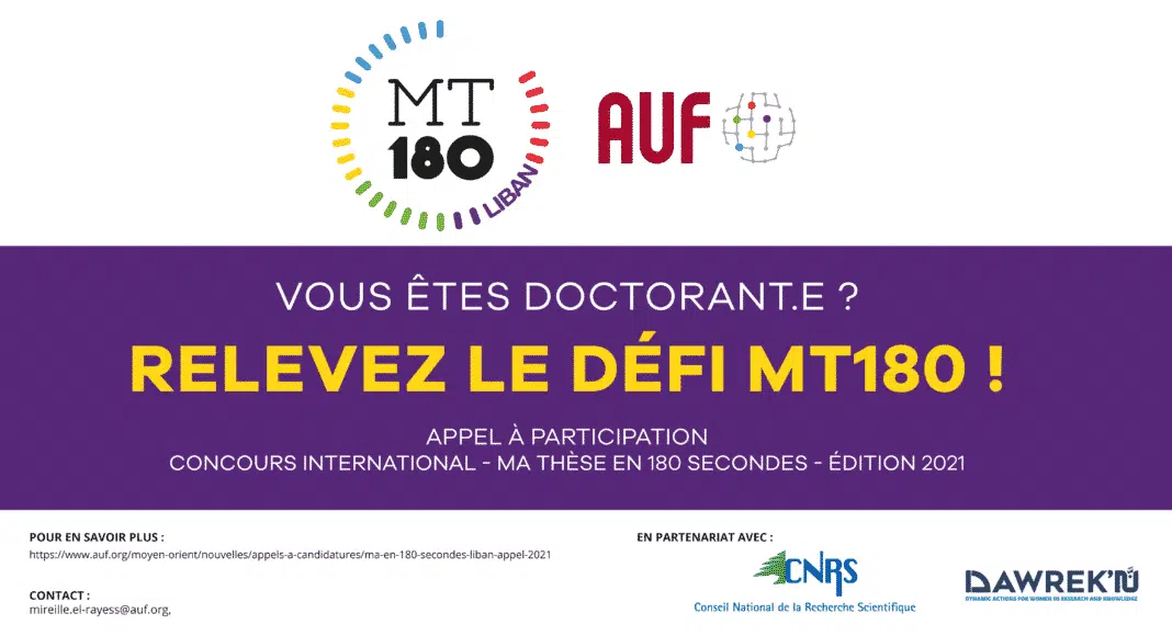L’Agence universitaire de la Francophonie au Moyen-Orient et le CNRS-Liban organisent la 4ème édition du concours Ma Thèse en 180 secondes-Liban qui se déroulera le 3 juin 2021.