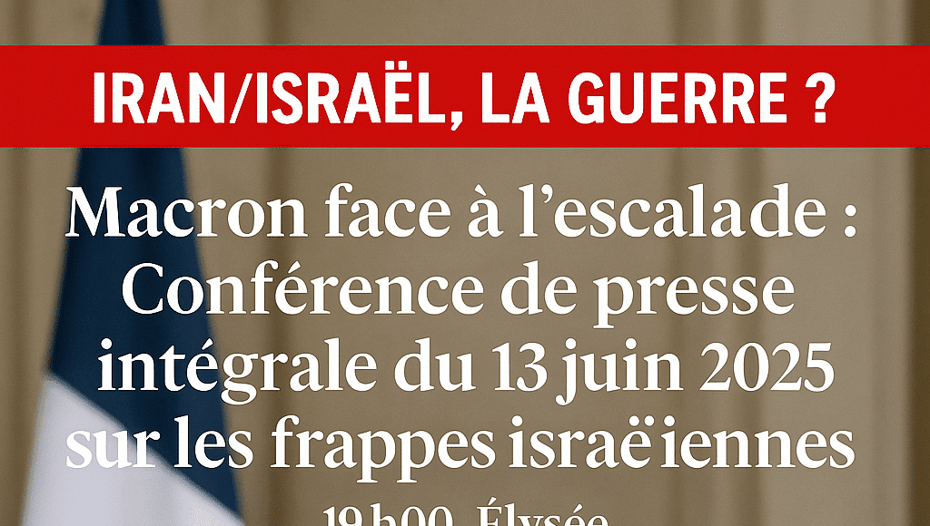 Le 13 juin 2025, à 19h00, le président français Emmanuel Macron s’exprime depuis le Palais de l’Élysée lors d’une conférence de presse pour réagir aux frappes aériennes israéliennes contre des sites nucléaires et militaires iraniens dans le cadre de l’opération « Rising Lion ». Ses déclarations abordent l’escalade au Proche-Orient, les implications pour le Liban, la question palestinienne, et la position de la France face à la crise. Voici un compte rendu détaillé et factuel du contenu intégral de cette conférence.