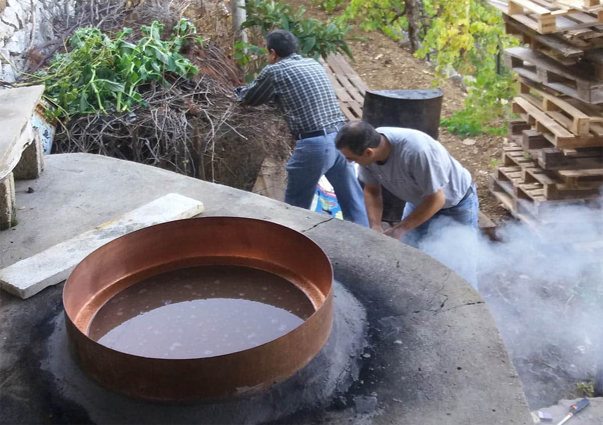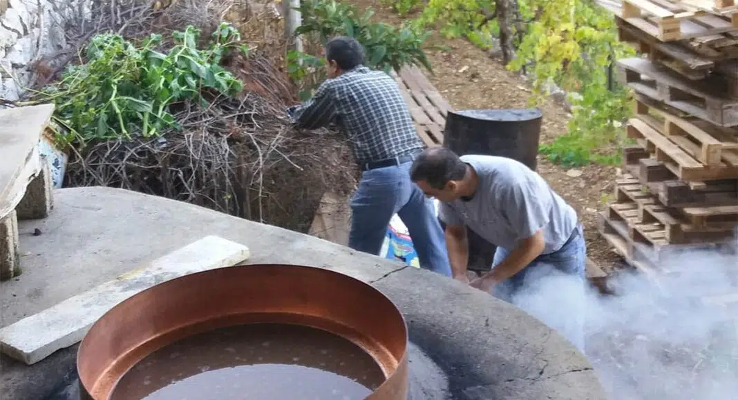 Aux grappes est mélangée une terre blanche appelée Houwwara. Chez les Samaha le pressoir en bois est vieux ; un vrai trésor. C’est là que les grappes une fois piétinées y sont mis pour en extraire tout leur jus. Il est recueilli au tamis dans un grand bassin. Transporté au chaudron, le liquide va bouillir pour être porté ensuite dans un bassin. Alors qu’on le laisse reposer deux heures afin de permettre aux impuretés de remonter à la surface, un délicieux parfum de sucre caramélisé émane. Le liquide sera encore une fois transporté au chaudron ; il sera chauffé pendant quatre heures environ afin de le transformer en mélasse. Il est presque minuit, et toute la famille attend patiemment ce liquide épais et sirupeux. La mélasse sera incorporée dans un gâteau sec, confiture de figue, et bien d’autres délices. Il y en aura assez pour passer un hiver en … douceur.