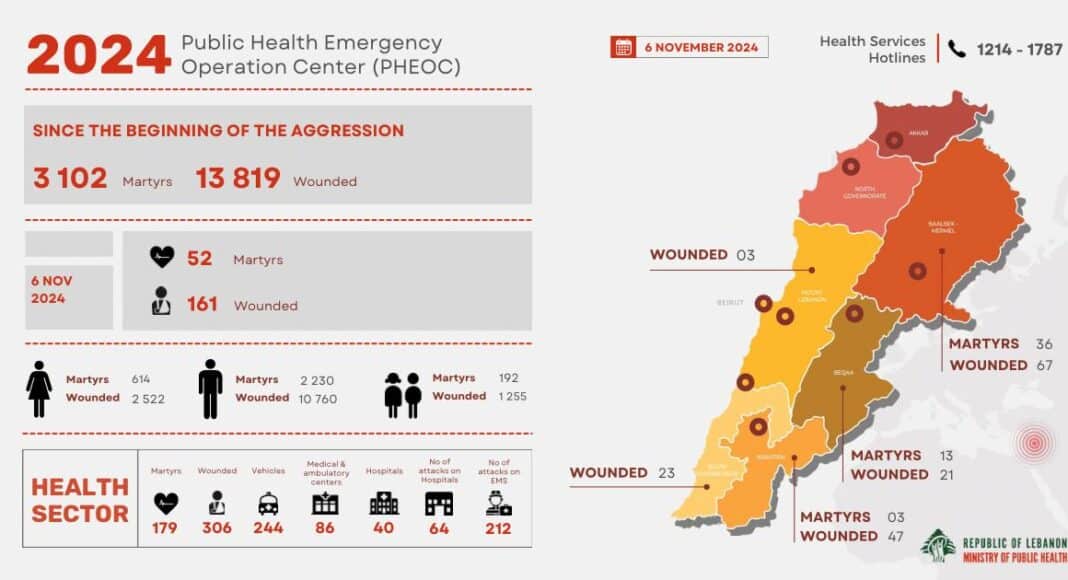 Le Centre dâopérations dâurgence de la santé publique, affilié au ministère de la Santé publique du Liban, a publié son rapport quotidien concernant les conséquences de lâagression israélienne sur le pays. Selon ce rapport, les frappes israéliennes de la journée du mercredi 6 novembre 2024 ont causé la mort de 52 personnes et ont blessé 161 autres, aggravant le bilan humain et les souffrances de la population libanaise.