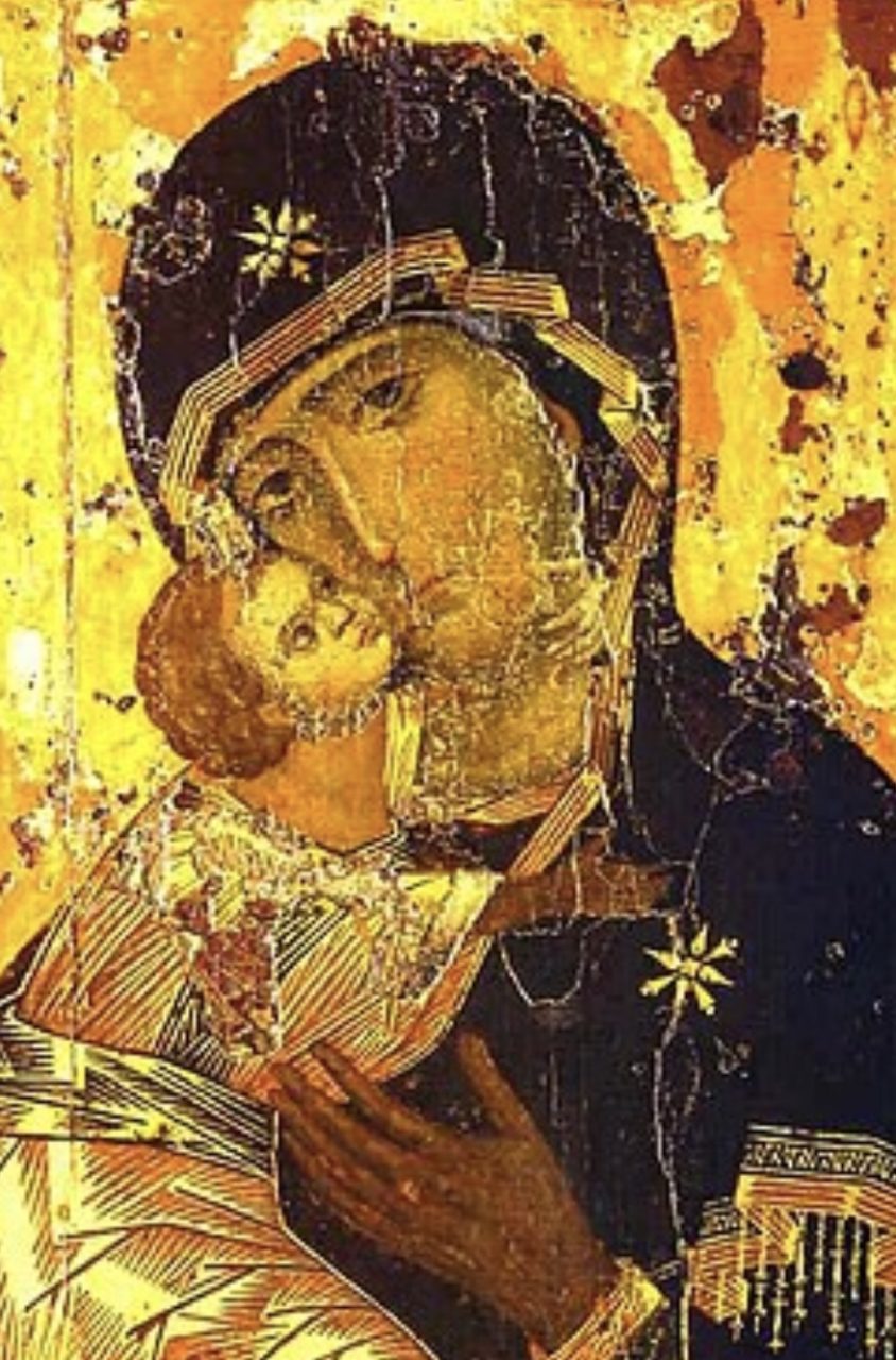Sur l’icône de la Vierge à l’enfant, sa silhouette de maman, affectueusement courbée sur sa progéniture, se contente de nous indiquer la lumière. Elle nous appelle, dans sa sainte humilité et son effacement, à regarder à notre tour, celui qu’elle-même regarde, et à contempler, avec elle, la source de lumière, son fils et son Dieu, notre frère et notre Dieu, le Christ.