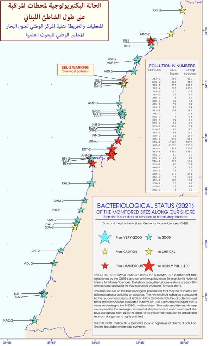 Selon les auteurs de ce rapport, 24 sites sont ainsi fréquentables pour les nageurs locaux et 8 sites formellement déconseillés, parmi lesquels, Batroun en raison d’une pollution aux phosphates, Dbayeh et Beyrouth, à quelques exceptions près et celles de Tripoli et du Akkar.