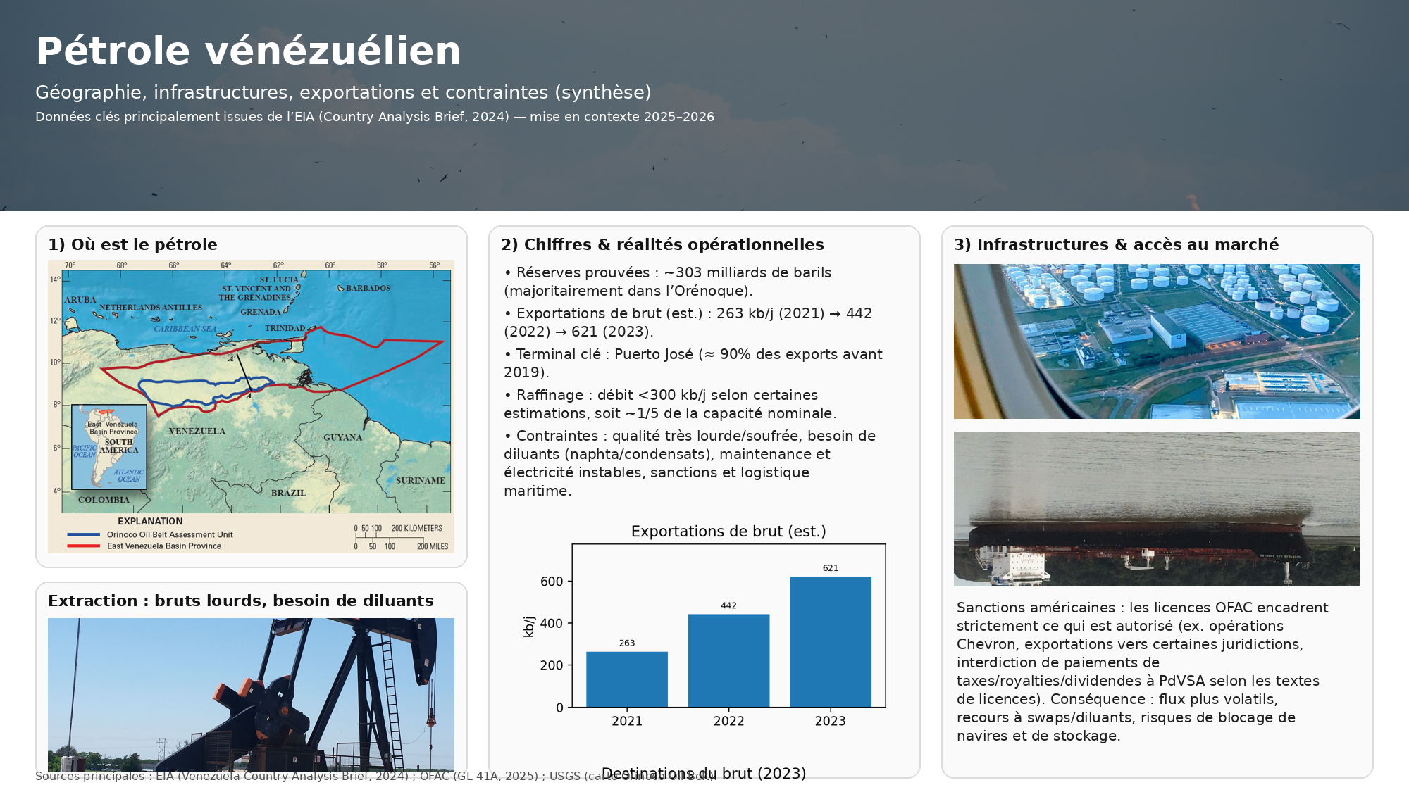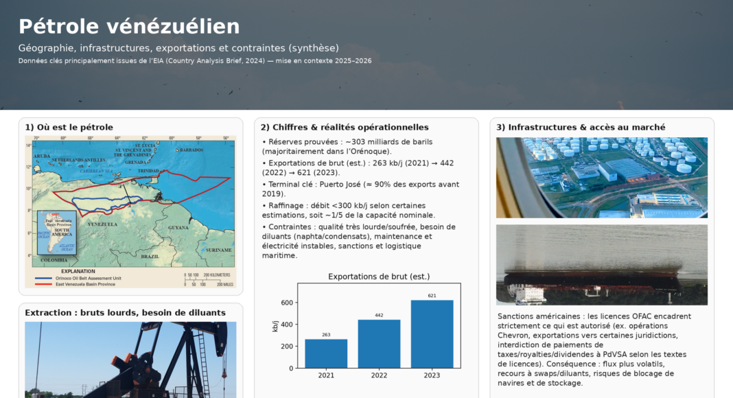 Fin 2025, plusieurs signaux publics ont décrit une tension extrême : exportations contraintes, tankers dissuadés, accumulation de produits lourds résiduels et pression sur les capacités de stockage, au point d’inquiéter sur la continuité opérationnelle de certaines installations. Ce type d’épisode illustre la réalité du pétrole vénézuélien : la variable critique n’est pas seulement le nombre de barils dans le sous-sol, mais la capacité à faire circuler ces barils dans un système financier et maritime qui accepte de les porter.