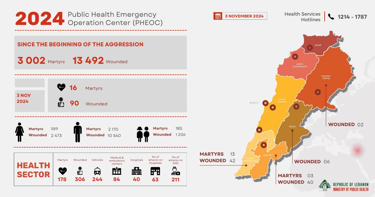 La situation au Liban devient de plus en plus désespérée, alors que le pays tente de faire face à une crise humanitaire aggravée par les violences et les destructions. Le Ministère de la Santé publique, à travers le Centre d’opération d’urgence de santé publique (PHEOC), travaille sans relâche pour coordonner les efforts de réponse aux urgences médicales, mais les moyens s’épuisent rapidement face à l’ampleur de la crise. Les pertes humaines dépassent désormais les 3 000 morts, tandis que plus de 13 000 personnes sont blessées, dont beaucoup nécessitent des soins médicaux urgents et continus.