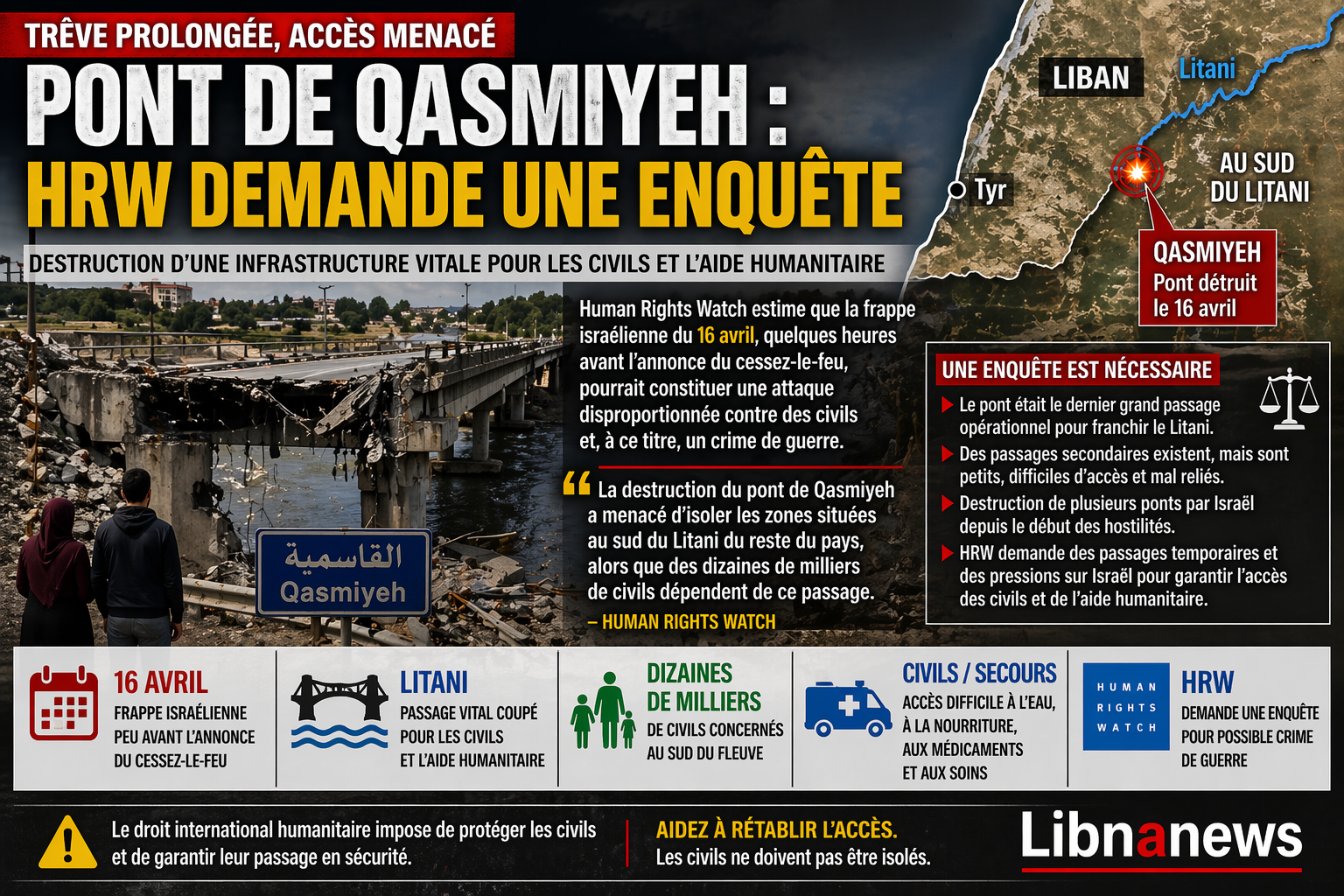 Human Rights Watch affirme que l’armée israélienne a détruit le pont de Qasmiyeh le 16 avril, peu avant l’annonce d’un cessez-le-feu entre Israël et le Liban. L’organisation présente cette infrastructure comme le dernier passage principal utilisable par les civils et par les convois d’aide pour franchir le Litani et relier le sud du fleuve au reste du pays.