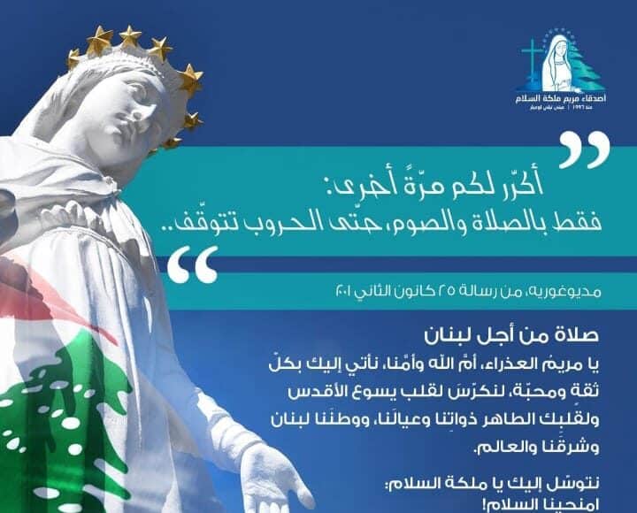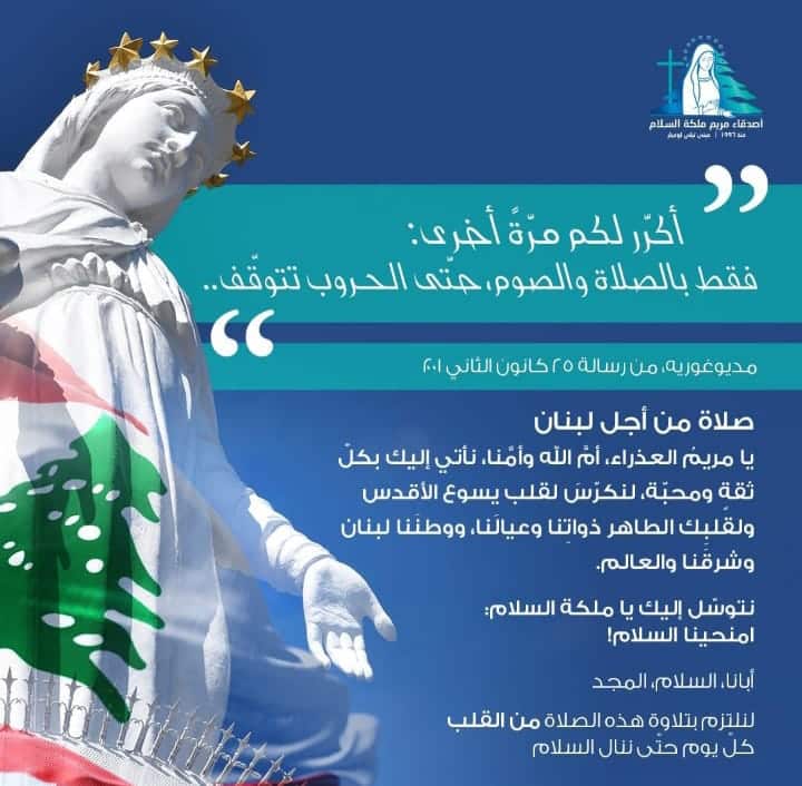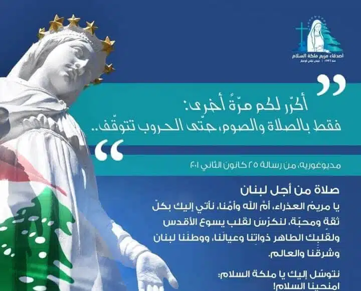 Dans une période de grande incertitude et de turbulences, l’association Amis de Marie, Reine de la Paix appelle les croyants du monde entier à se tourner vers la prière pour le Liban. S’inspirant d’un message divin de la Vierge Marie, diffusé le 25 janvier 2001, le message est clair : « Je vous le répète une dernière fois : seulement par la prière et le jeûne, les guerres cesseront. »