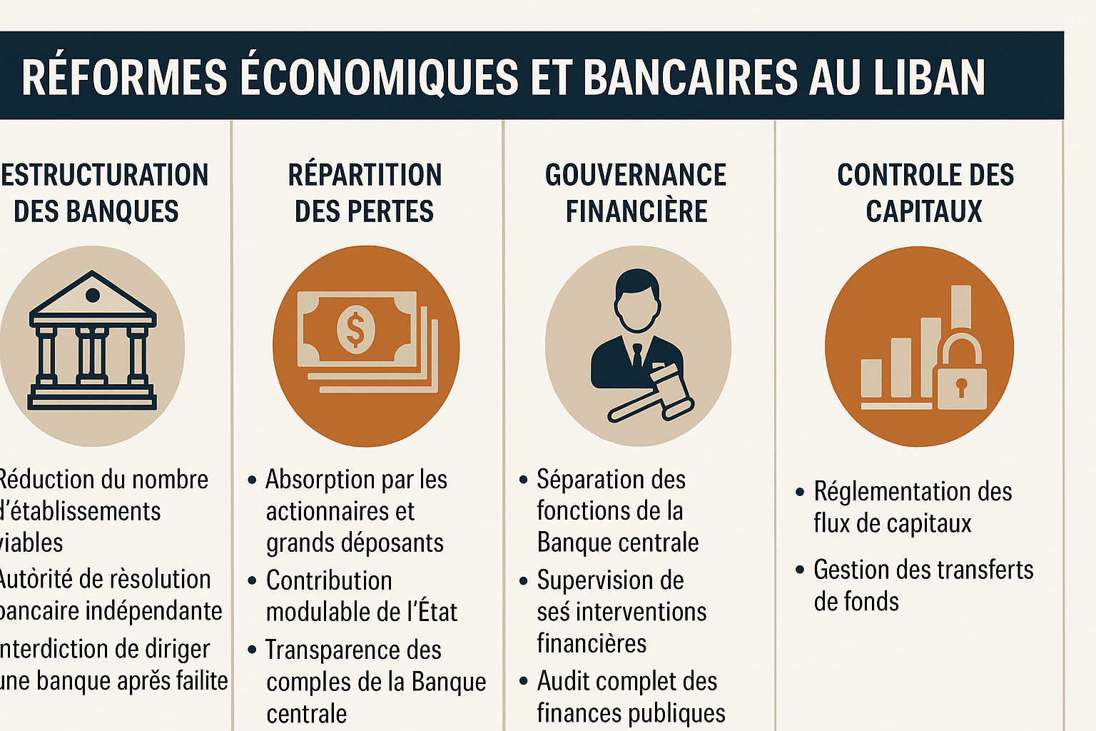 Le Fonds monétaire international a formulé depuis 2022 un cadre de référence clair pour soutenir le redressement libanais. Ce cadre repose sur cinq piliers : restructuration bancaire, réforme budgétaire, réforme du secteur public, lutte contre la corruption et transparence financière. Malgré les engagements verbaux des autorités, très peu de ces piliers ont donné lieu à des textes concrets adoptés par le Parlement.