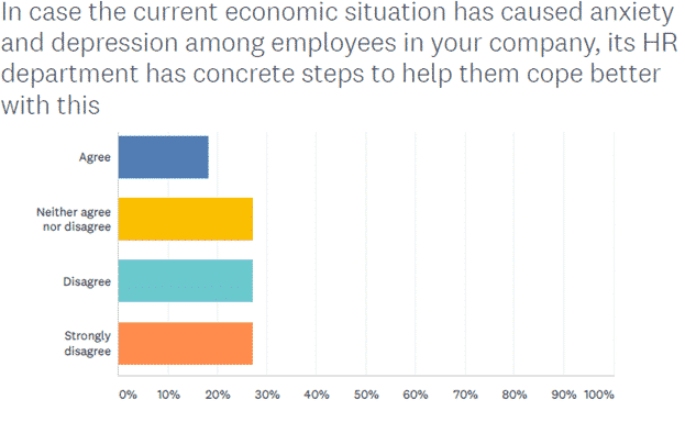 Cela étant lié au Liban, entres autres à la chute de la livre libanaise par rapport au dollar, et au taux de chômage. Et au monde entier par la crise du Covid 19. En conséquence, les statistiques sont sans appel. Étant donné quen54.54% des intervenants de l’étude scientifique article disent de pas être d’accords avec la clause que « Au cas où la situation économique actuelle aurait provoqué de l’anxiété et dépression chez les employés de votre entreprise, ses RH le ministère a des mesures concrètes pour les aider à mieux faire face avec ça ». Or, que 27.27 % des intervenants n’ont aucune opinion, et que seul 18.18% des réponses collectées sont d’accords.
