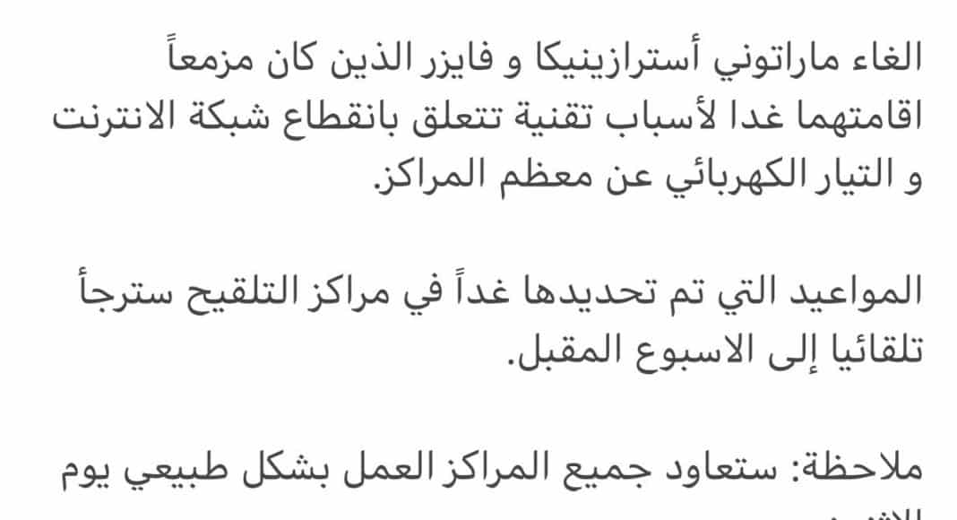 Les autorités libanaises annoncent que les rendez-vous et le marathon Pfizer et AstraZeneca qui devaient se poursuivre demain seront remis à la semaine prochaine, même heures, pour cause de pannes d’électricité et d’internet « dans la majorité des centres de vaccination ».