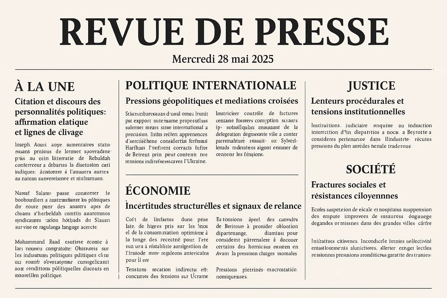 Le 28 mai 2025, les journaux libanais ont mis en avant une conjonction de sujets reflétant la complexité de la situation nationale et régionale. Entre instabilités frontalières, négociations diplomatiques, évolutions électorales et enjeux de gouvernance, les manchettes illustrent une actualité dense, marquée à la fois par l’urgence sécuritaire et les aspirations à la stabilisation politique.