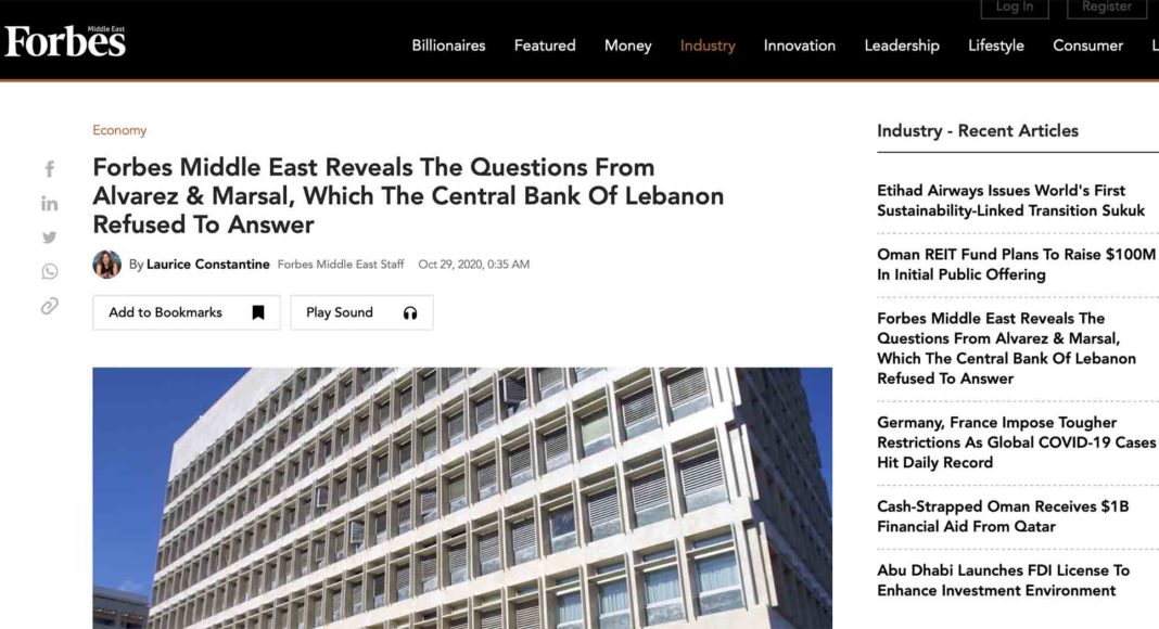 Selon Forbes, plus de 100 questions posées par Alvarez & Marsal n’auraient pas eu de réponses de la part de la Banque du Liban qui se retranche sous les législations liées au secret bancaire. Le site rappelle également que le ministre des finances, proche du Président de la Chambre Nabih Berri, avait indiqué que ses soutiens politiques ne souhaitaient pas que soient conduits un audit juricomptable des comptes de la Banque du Liban.