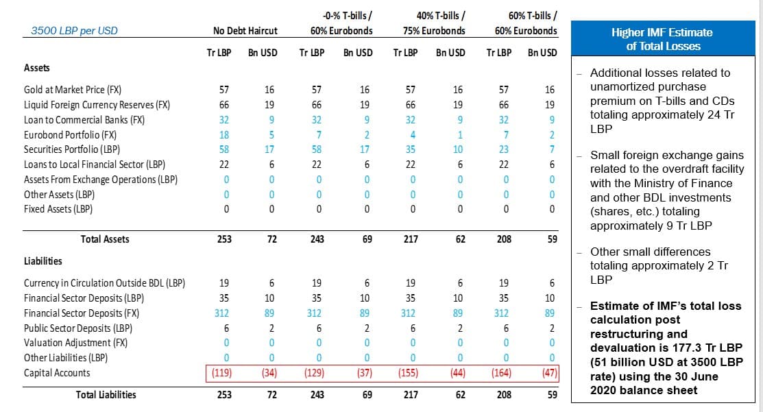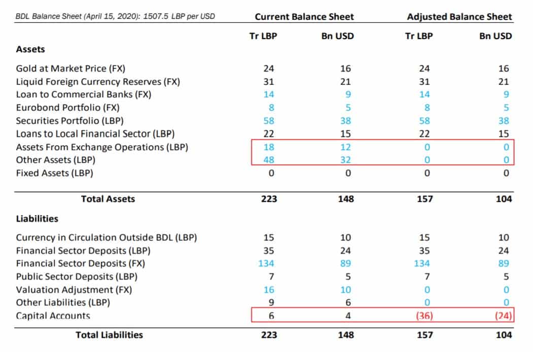 Le financier Mike Azar a expliqué sur son compte Twitter que si la BDL avait publié ses documents comptables de manière transparente et utilisé les meilleures pratiques comptables, sa situation nette aurait été négative (à -24 milliards de dollars) plutôt que positive (4 milliards de dollars) à la mi-avril. Selon lui, avec le cours actuel de la livre, la situation nette de la BDL pourrait désormais être de -50 milliards de dollars. Ceci confirme le montant avancé plus tôt par l’économiste François el-Bacha pour recapitaliser la BDL.